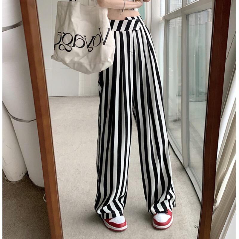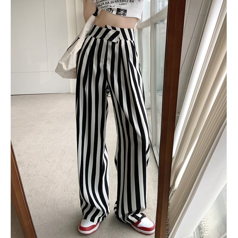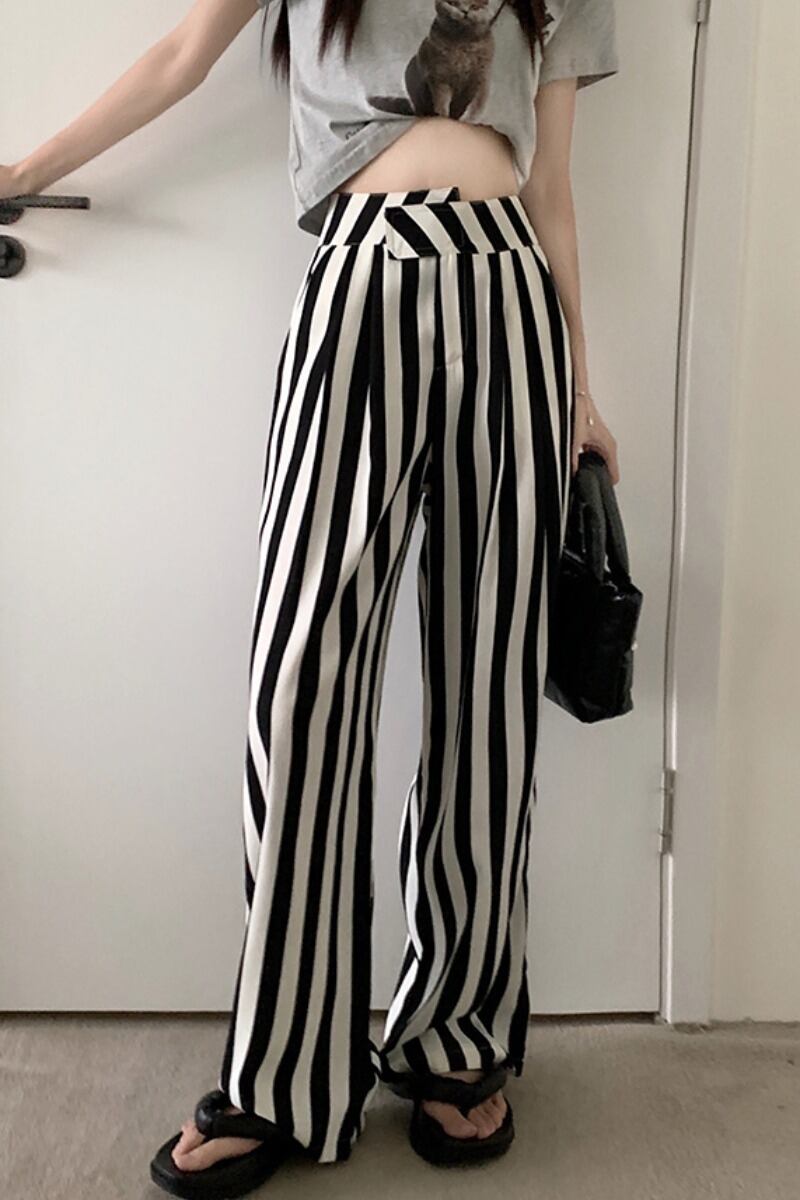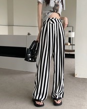 Nomikuma 因果ブラックホワイトストライプパンツ女性春夏長ズボンウエストワイドレッグパンツ ロング スプリング 春物 サマー 夏物 ワイドパンツ kor409671390