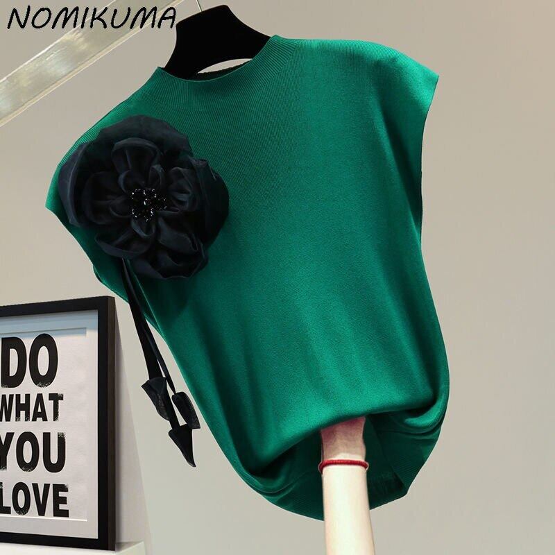 Nomikuma 3DビーズフラワーノースリーブTシャツ女性春夏無地因果OネックニットグラフィックTシャツ スプリング 春物 サマー 夏物 ソリッドカラー フラワーデザイン kor45113976035