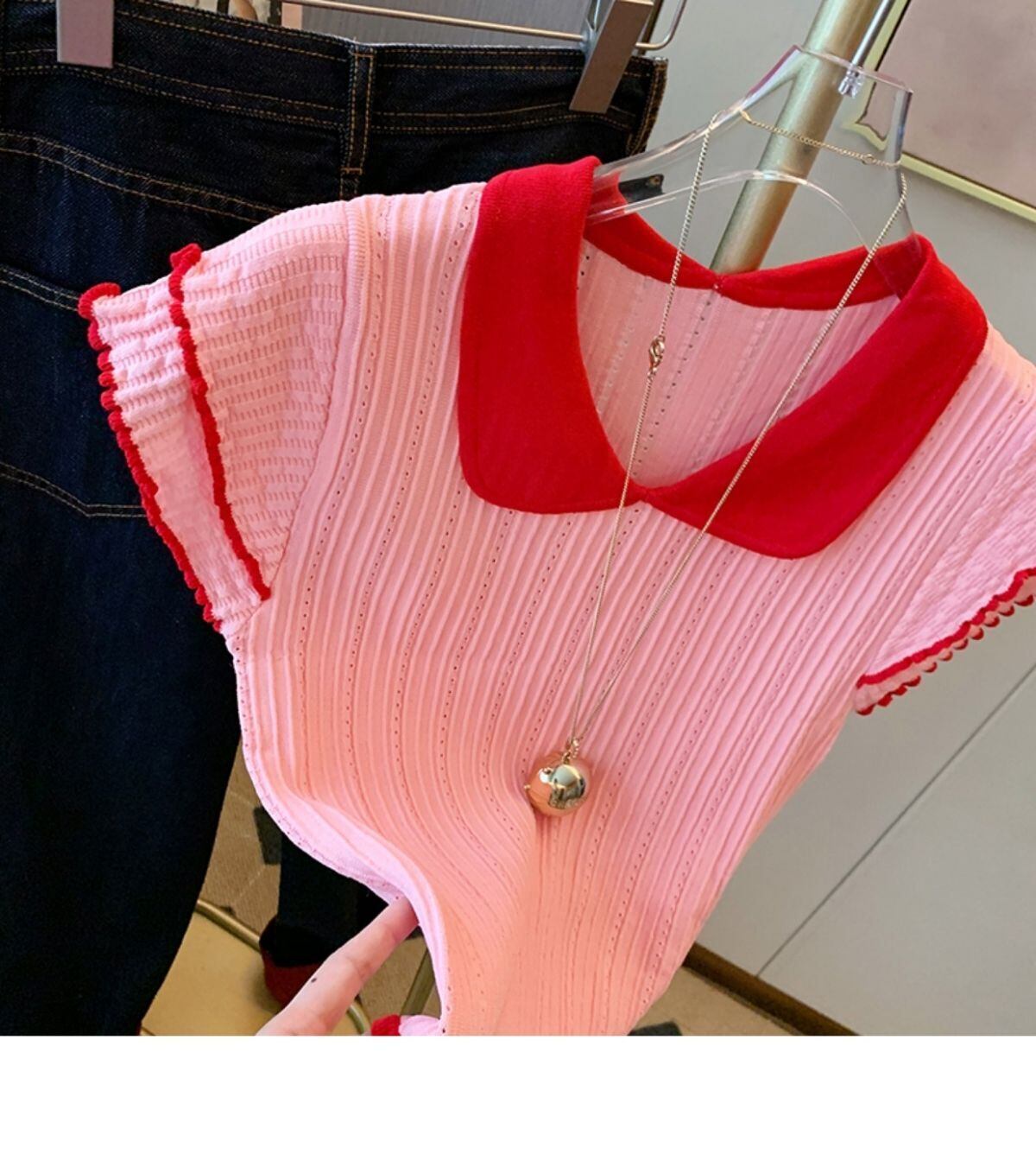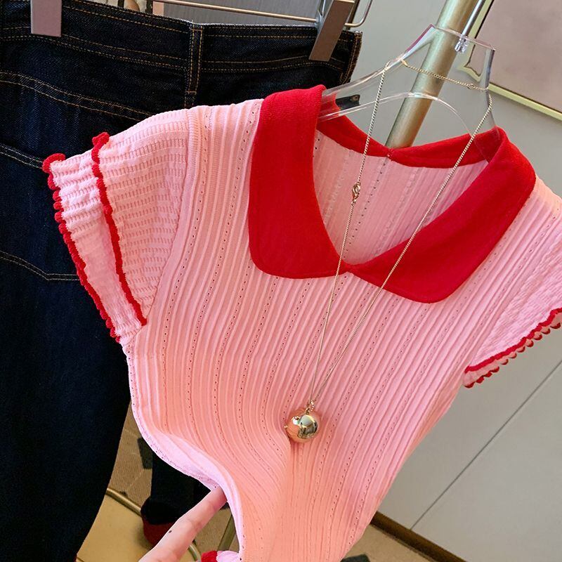 Nomikuma ピンクフライングスリーブニットベスト女性夏薄型プルオーバー因果ヒットカラーピーターパン襟セータートップス サマー 夏物 kor30427162699
