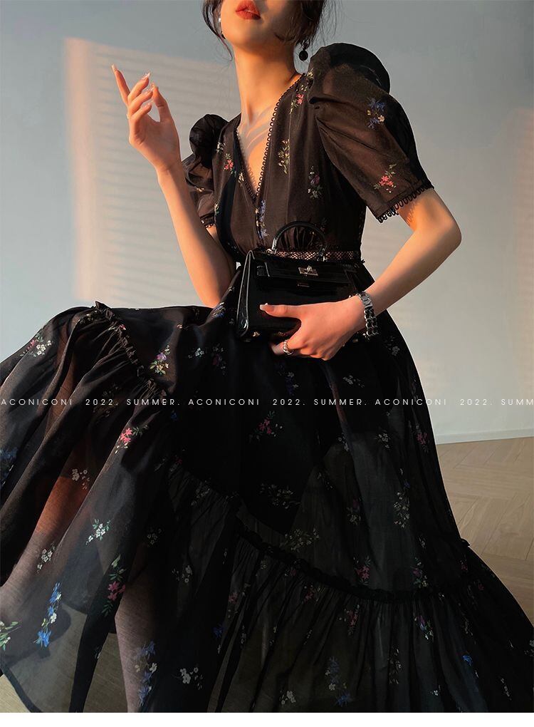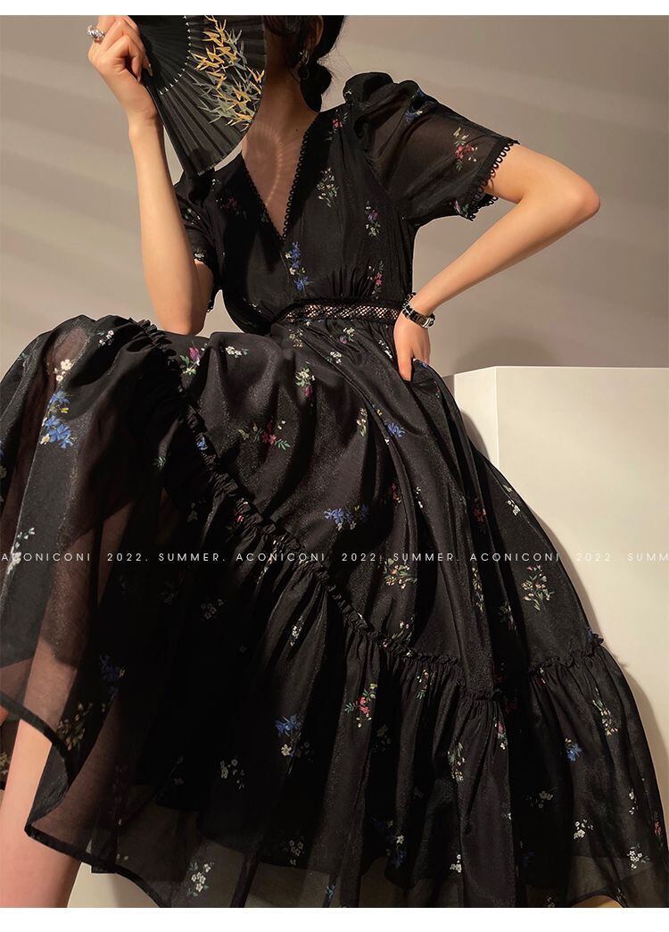 Nomikuma 黒花柄女性ドレス夏半袖 V ネック Vestido ウエスト因果 A ライン ドレス ショート ブラック ハーフスリーブ サマー 夏物 Vネック Aライン kor83186039318
