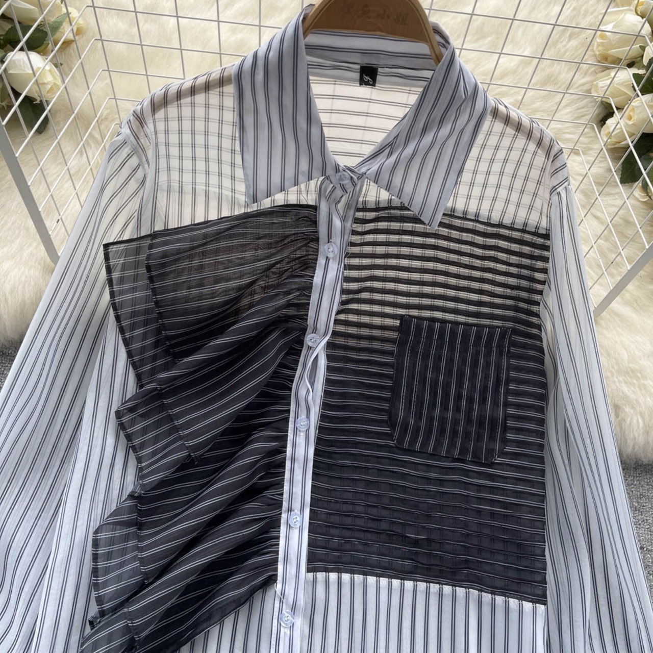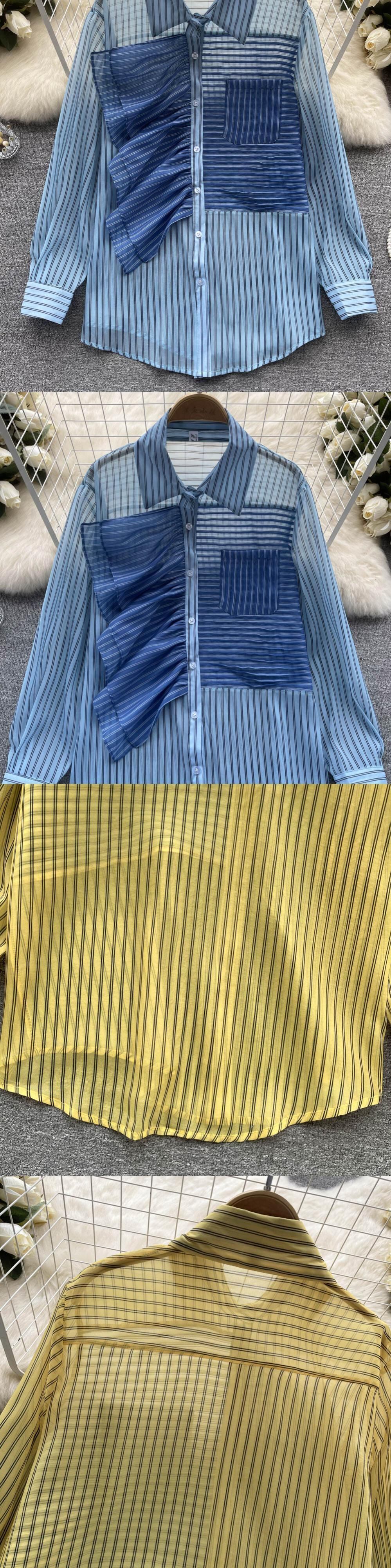 ノミクマ ストライプ シースルー ブラウス フリル パッチワーク レディース シャツ 春 長袖 ターンダウンカラー ロング スプリング 春物 kor96616330513