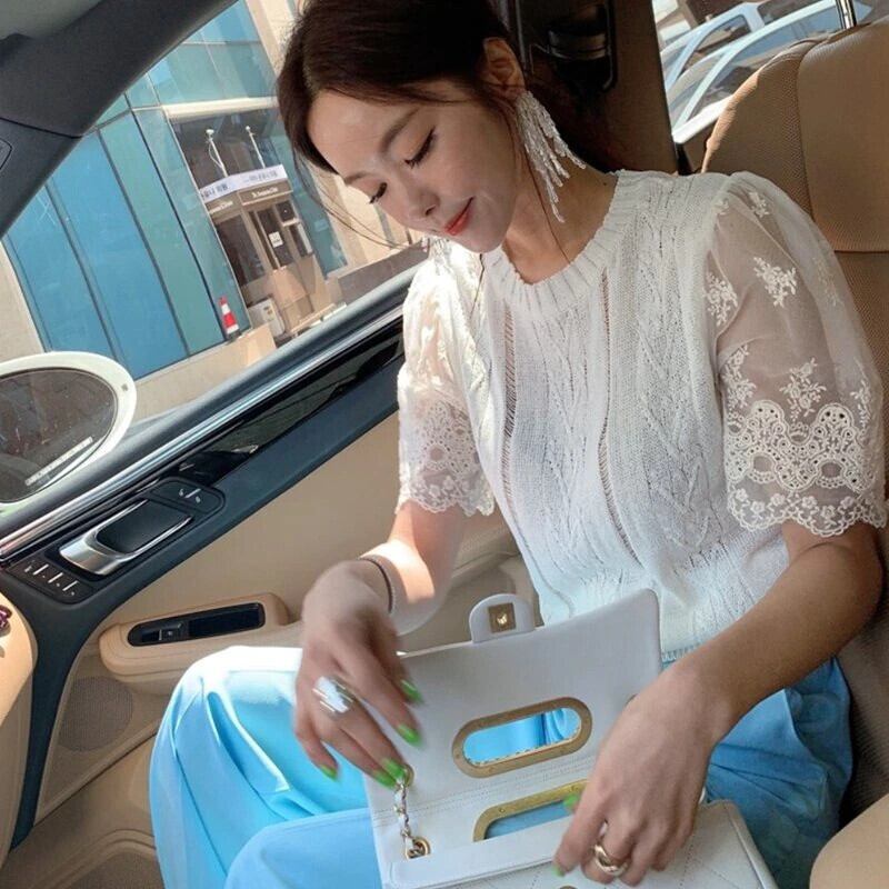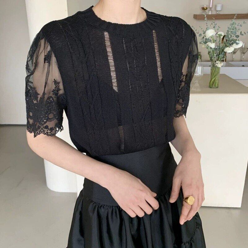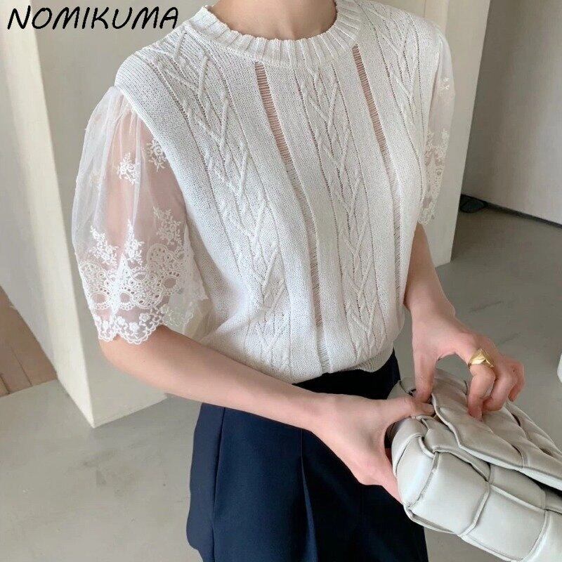 Nomikuma メッシュ半袖パッチワークニット Tシャツ中空アウト女性 Tシャツトップス春グラフィック Tシャツ ショート ハーフスリーブ スプリング 春物 kor33301080372