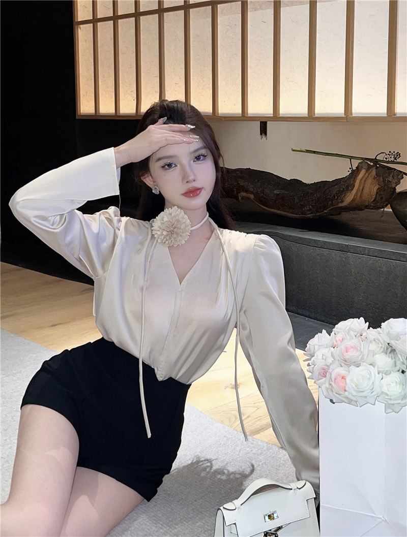 Nomikuma ブラウス レディース シック 3D フラワー Vネック ブラウス シャツ 因果 パフ 長袖 トップス 春 ロング スプリング 春物 フラワーデザイン kor45722406213