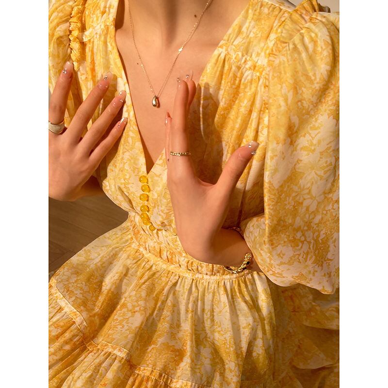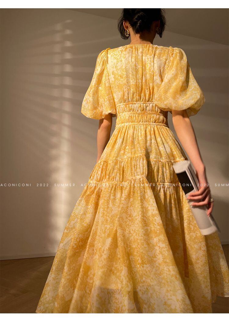 Nomikuma 印刷ウエスト因果 A ライン ロング ドレス ランタン スリーブ V ネック因果 A ラインの女性のドレス ランタンスリーブ Vネック Aライン kor85757288021