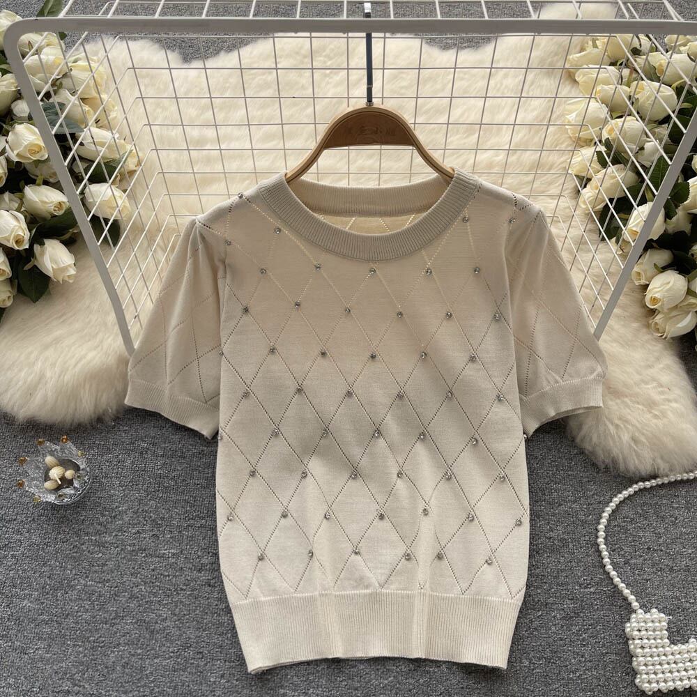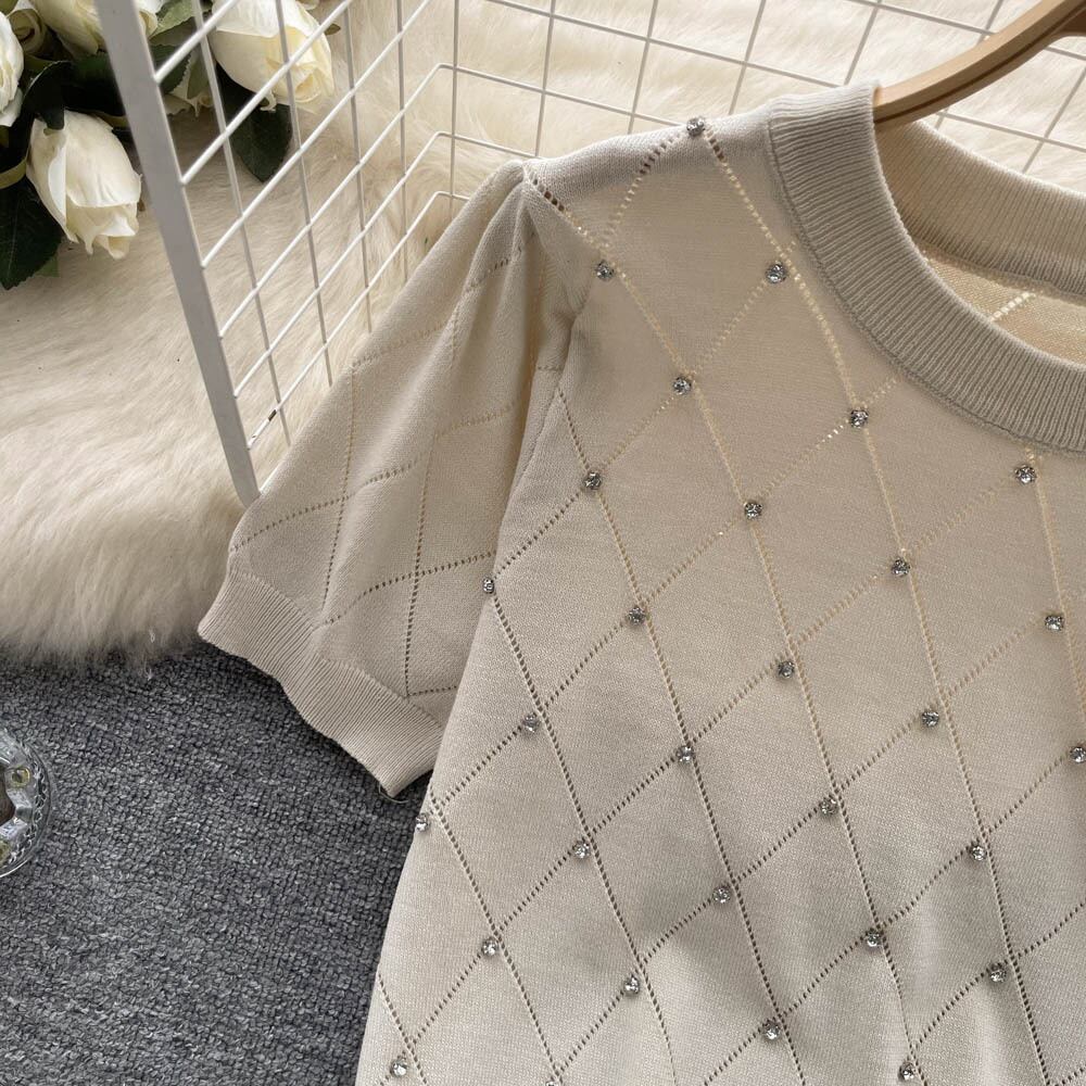 Nomikuma 夏スウィート Diamods ニットプルオーバートップス因果半袖 O ネック女性セーターセーターデ ショート ハーフスリーブ 大人ガーリー キュート カジュアル サマー 夏物 Oネック kor78094990747