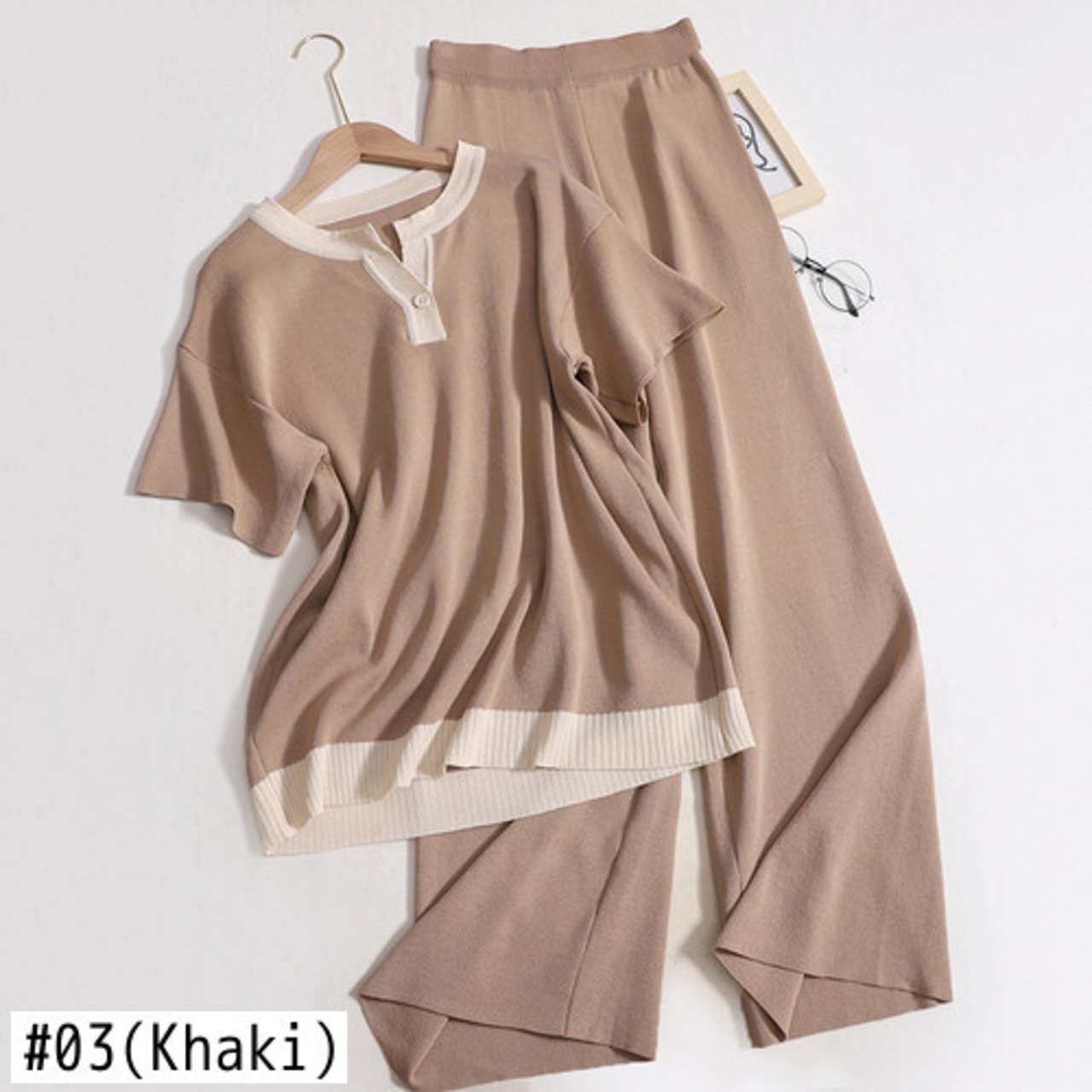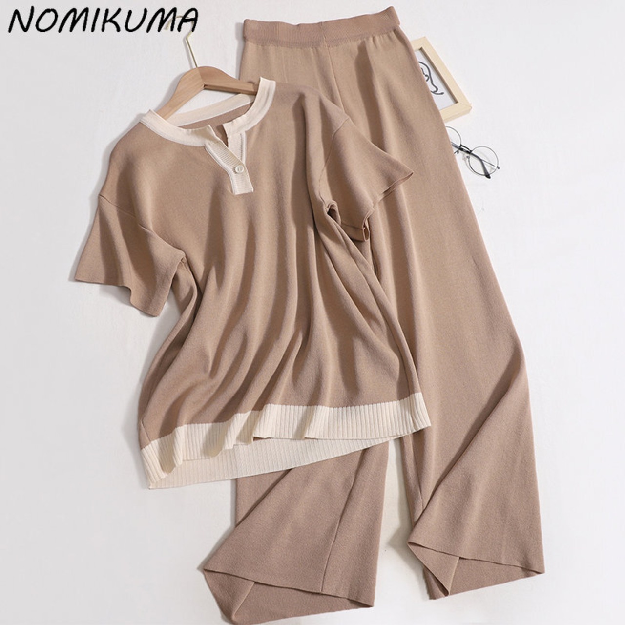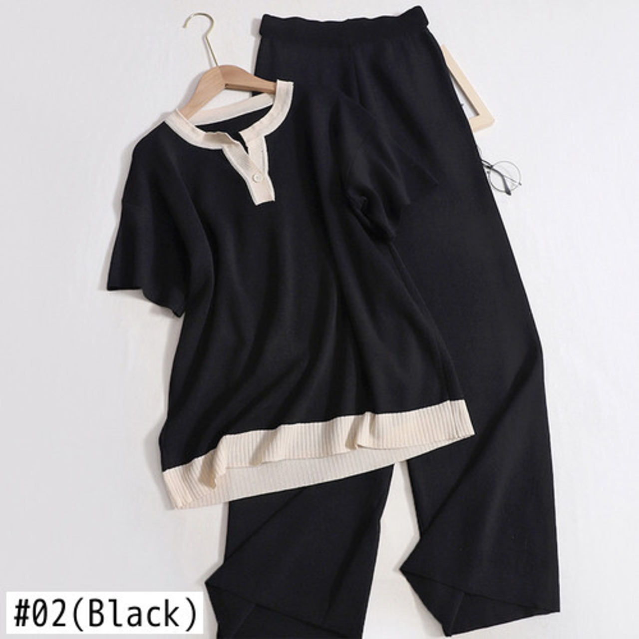 ノミクマ 2点セット レディース ヒットカラー Vネック 半袖 ニット トップス + ウエスト ワイドレッグ セーター ロングパンツ ショート ハーフスリーブ ワイドパンツ kor23830039457