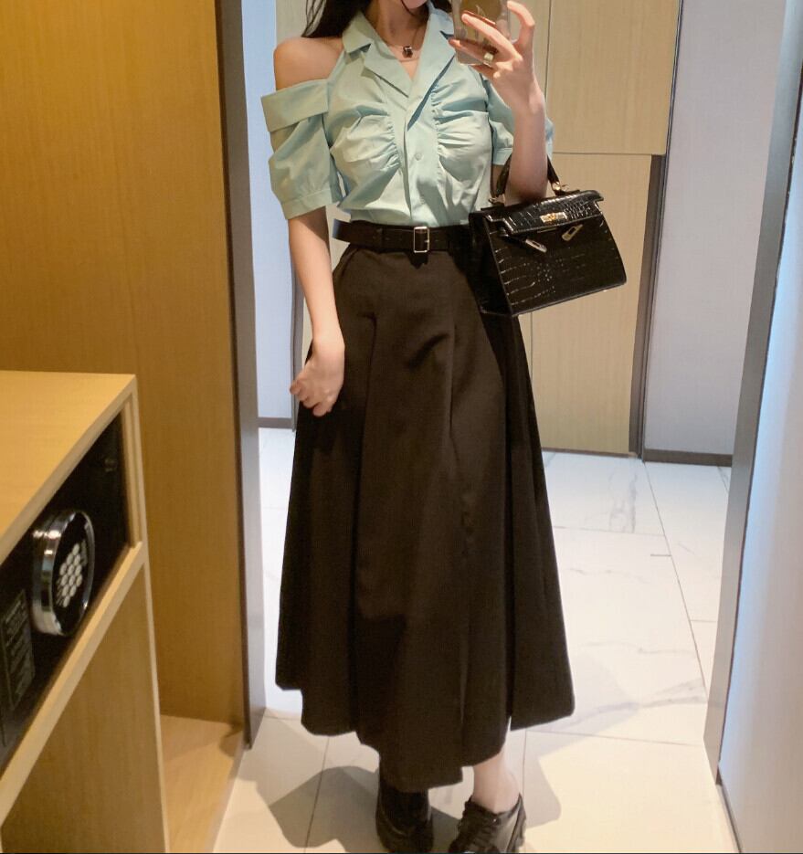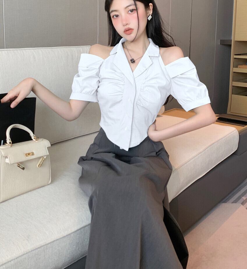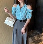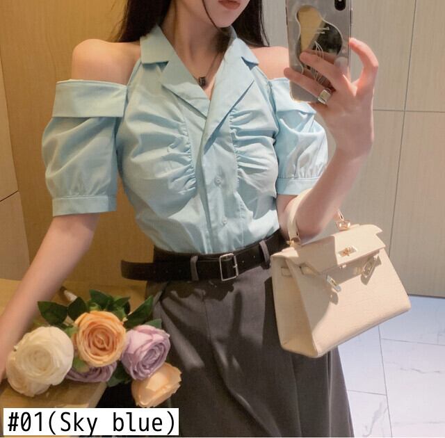 Nomikuma セクシーなストラップレスショート Slevee ノッチ襟ブラウストップススリムショート女性シャツ Sumemr デ kor71112307234