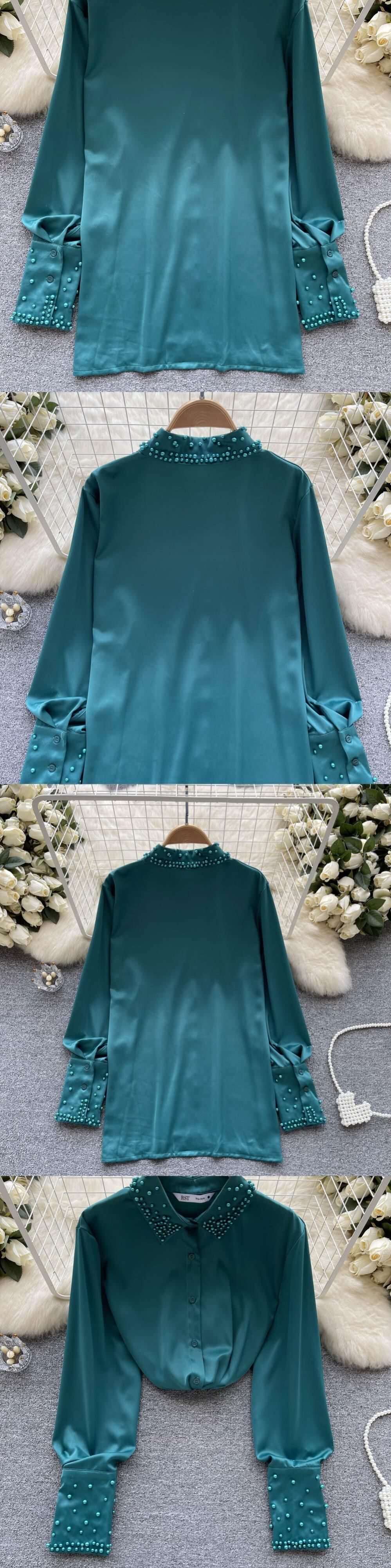 ノミクマ スプリングビーズ 長袖 ターンダウンカラー ブラウス シャツ 無地 シフォン トップス ロング 春物 ソリッドカラー kor42906064995