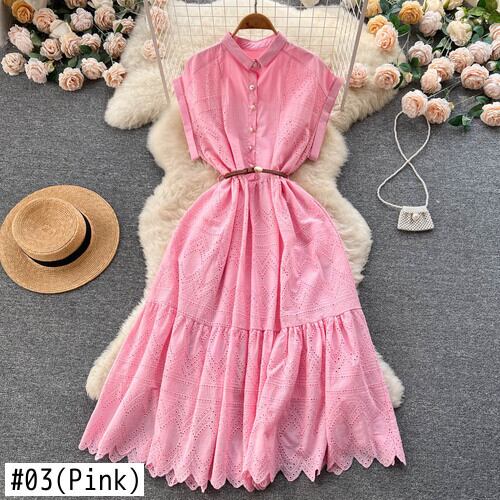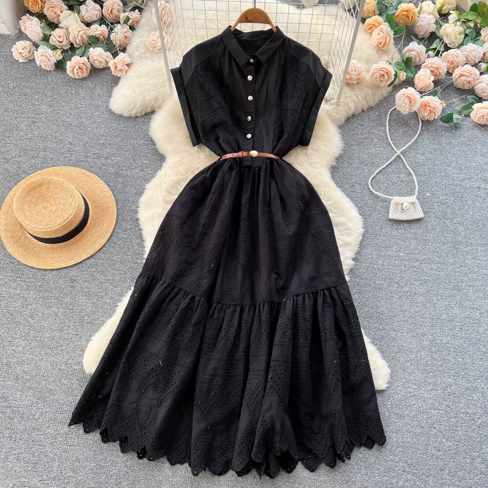 Nomikuma 夏ノースリーブ プリーツ スリム ウエスト ロング ドレス シックな中空アウト ターン ダウン襟女性ドレス サマー 夏物 kor4759798064