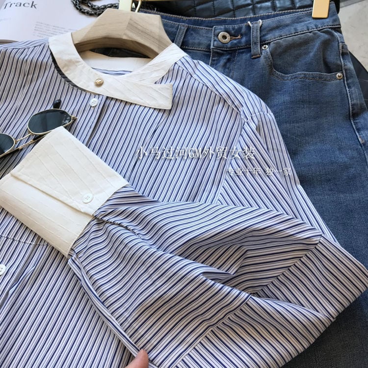 ノミクマ ストライプ ヒットカラー パッチワーク ランタン スリーブ 中空アウト O ネック ブラウス レディース 春 シャツ ランタンスリーブ スプリング 春物 Oネック kor96634786486
