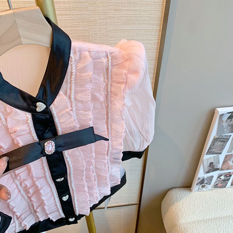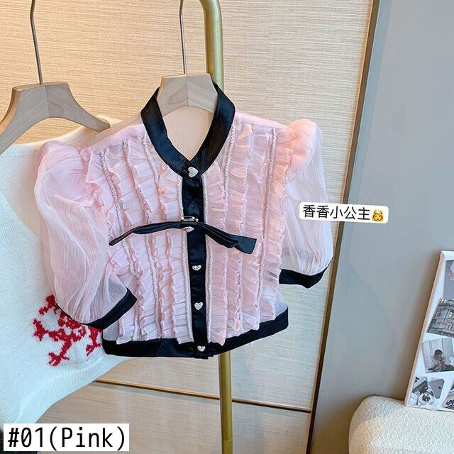 ノミクマ シック ヒットカラー スイート ショート ブラウス トップス パフスリーブ シングルブレスト Oネック シャツ 夏 大人ガーリー スウィート キュート カジュアル サマー 夏物 kor89731487655
