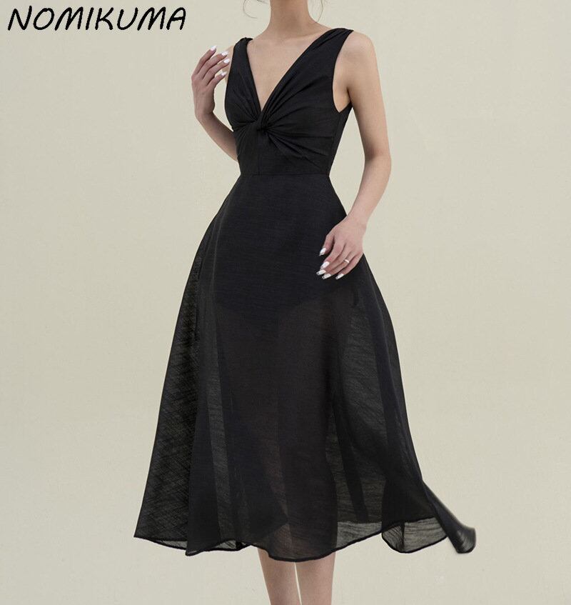 Nomikuma 夏 Vestidos ツイスト V ネック ノースリーブ メッシュ ドレス スリム ウエスト A ラインタンク ドレス サマー 夏物 Vネック Aライン