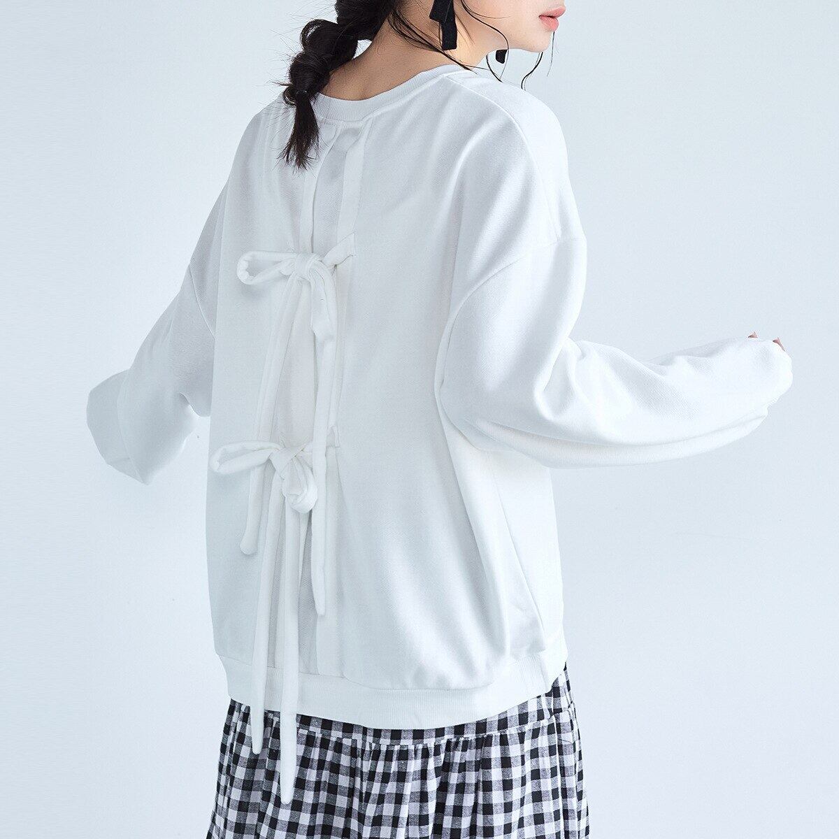 Nomikuma 春因果長袖 O ネックトレーナートップスバック蝶ネクタイプルオーバーパーカージャンパー服 ロング リボン スプリング 春物 Oネック