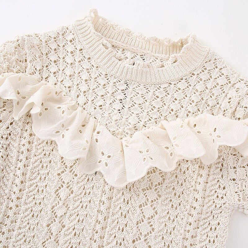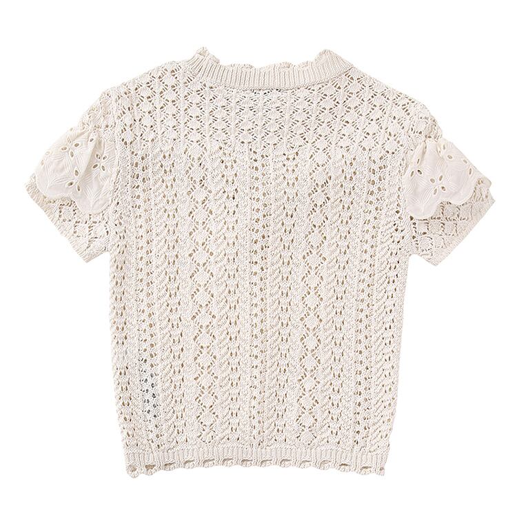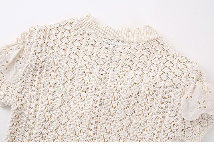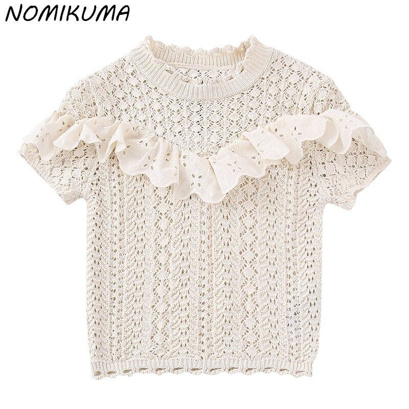 ノミクマシックフリルパッチワーク中空アウトニット春夏半袖Oネックプルオーバーニットセーター ショート ハーフスリーブ スプリング 春物 サマー 夏物