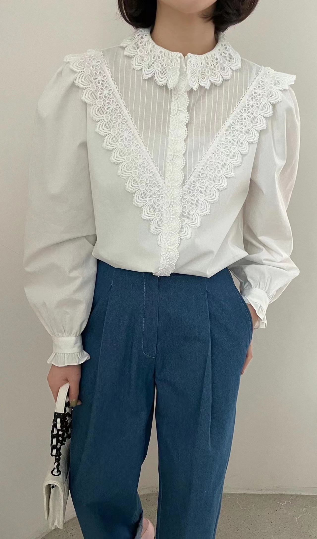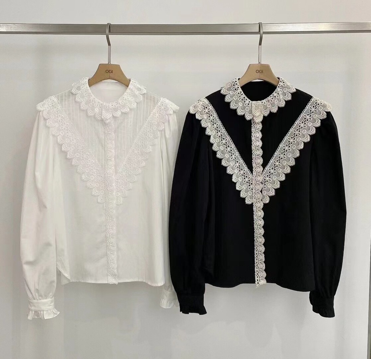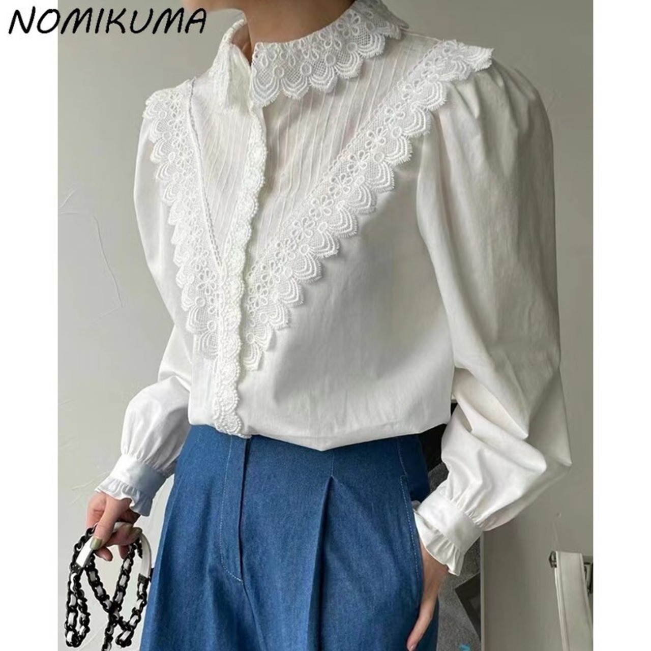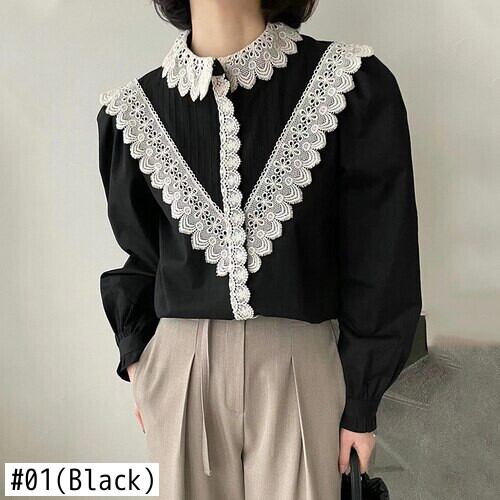Nomikuma シックなレースのパッチワーク ブラウス トップス長袖スタンド カラーシャツ春 ロング スプリング 春物