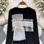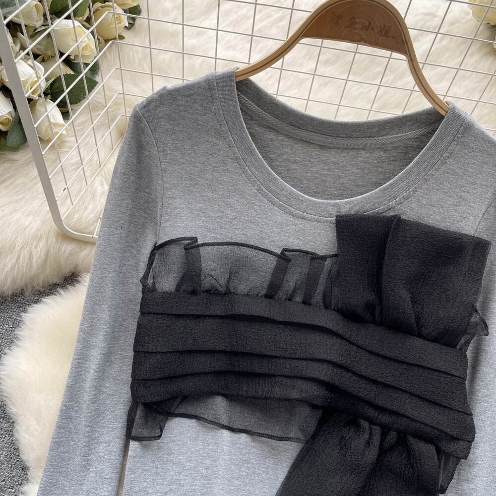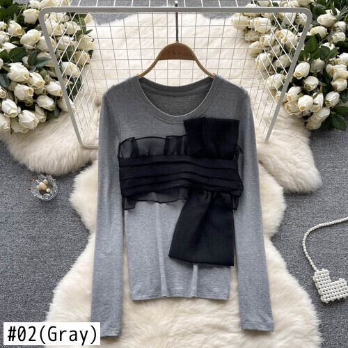 Nomikuma メッシュパッチワーク不規則なちょう結び長袖 Tシャツ春トップス因果グラフィック Tシャツ ロング リボン スプリング 春物