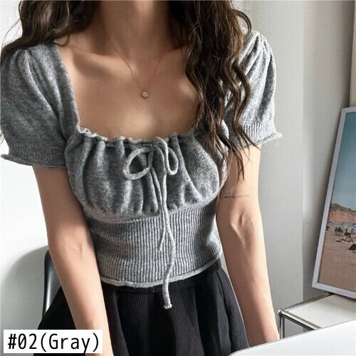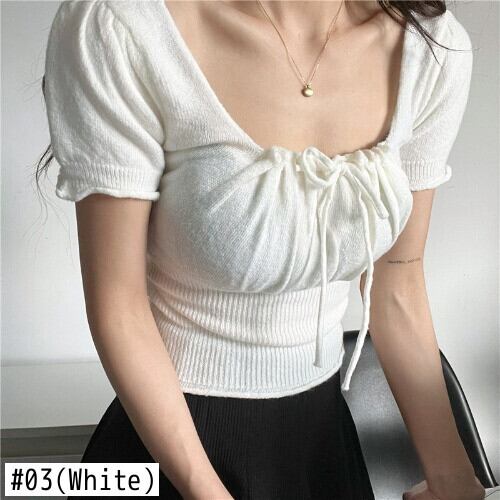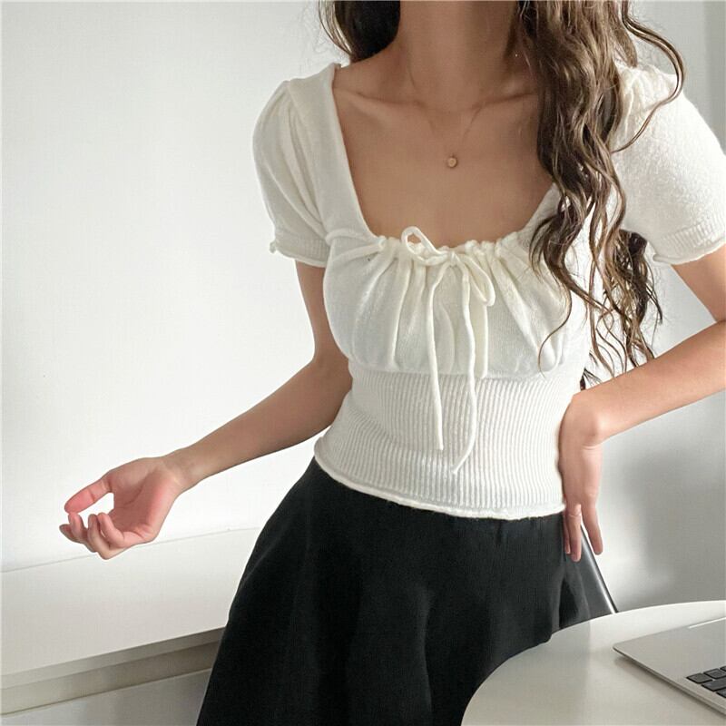 Nomikuma レースアップセクシーなスクエアカラーニット Tシャツ春夏半袖スリムショートグラフィック Tシャツ ハーフスリーブ スプリング 春物 サマー 夏物 スクウェア