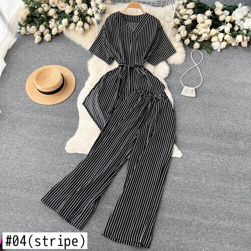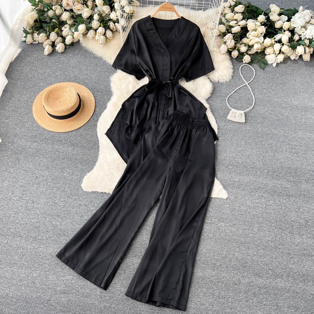 Nomikuma 春夏 2 点セット レディース セットアップ 半袖 Vネック レースアップ スリムウエスト トップス + ウエスト ワイドレッグ ロングパンツ ショート ハーフスリーブ スプリング 春物 サマー 夏物 ワイドパンツ