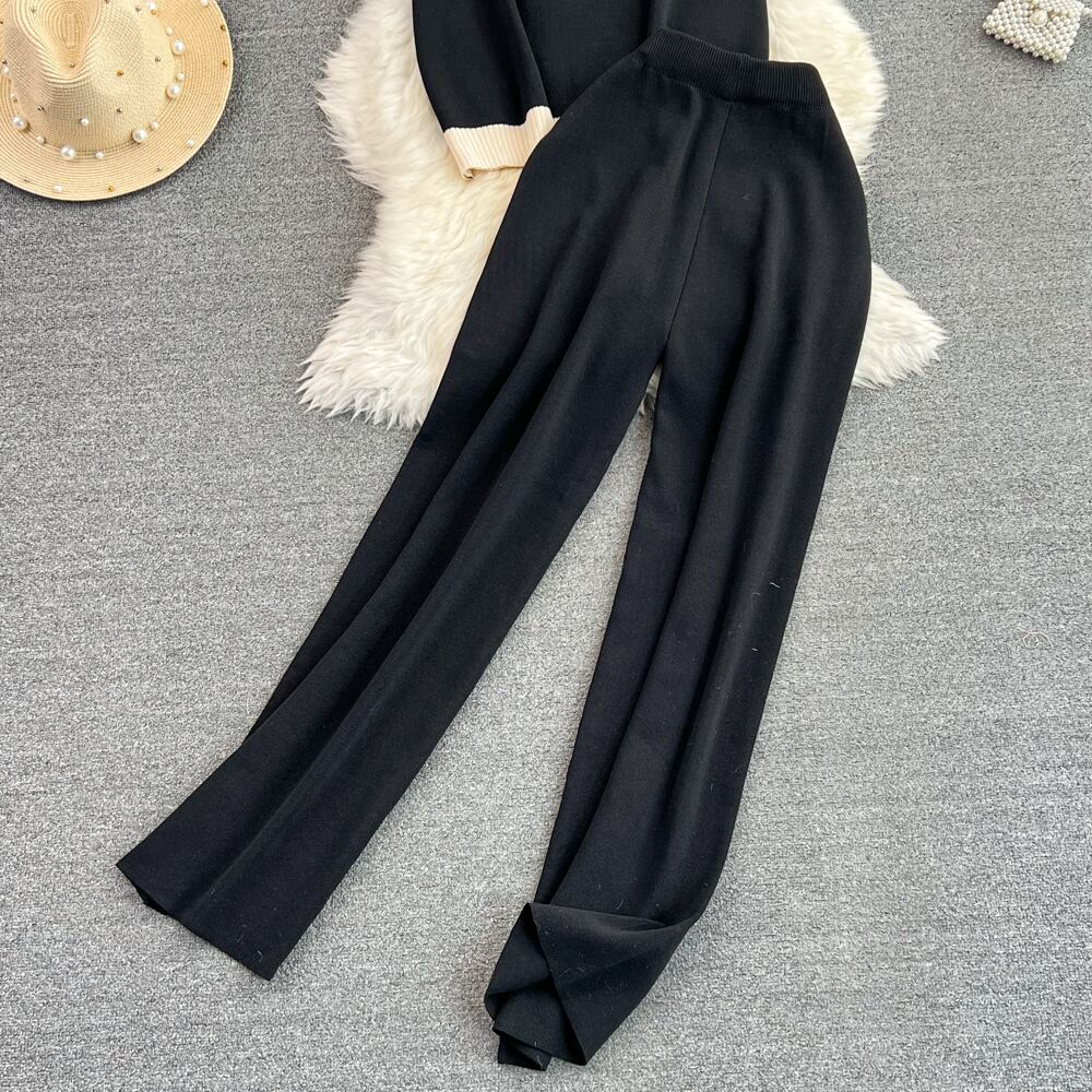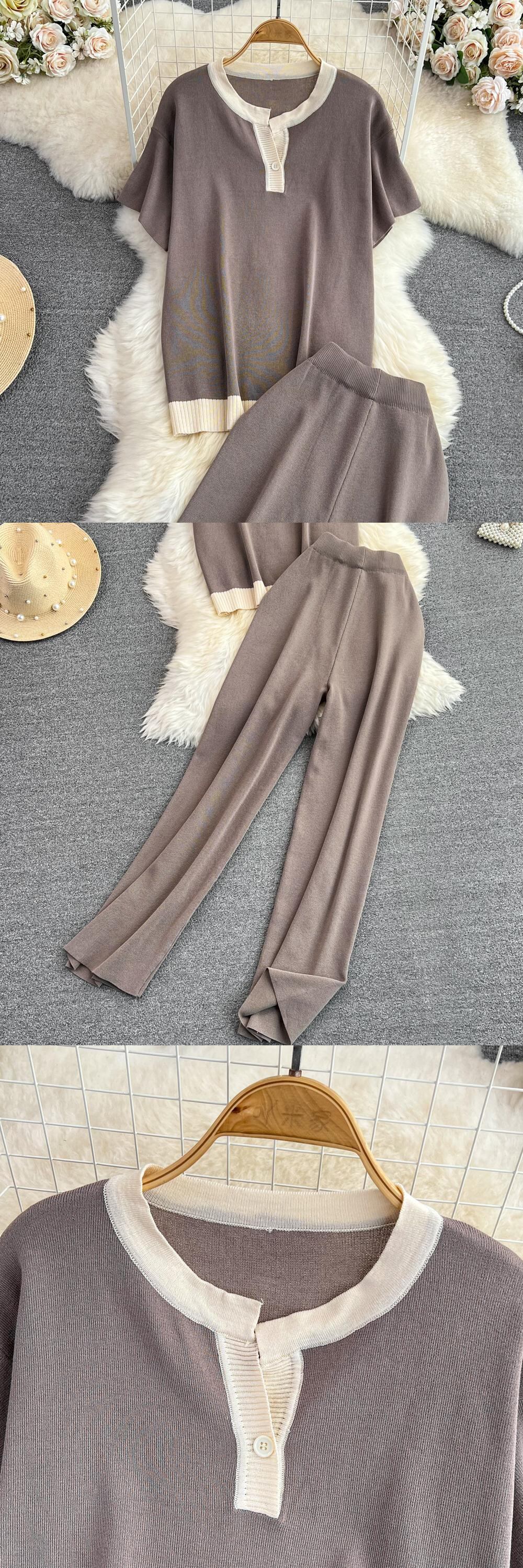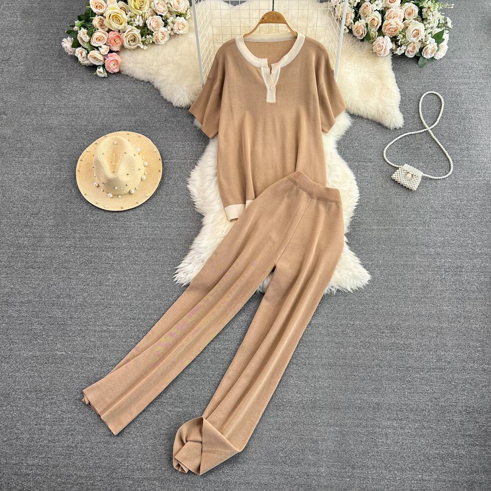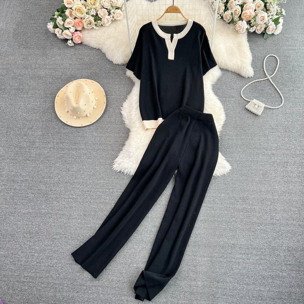 ノミクマ ヒットカラー Oネック カジュアル 半袖 ニット トップス+ウエストセーター ワイドパンツ 2点セット ショート ハーフスリーブ ワイドレッグ