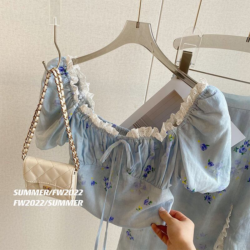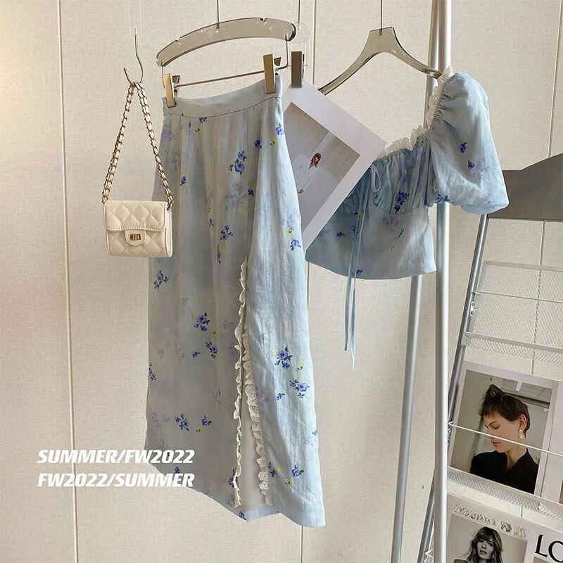 Nomikuma フローラル 2 ピースセット レースアップ スクエア カラー パフ スリーブ クロップ トップス + ウエスト セクシーなスプリット スカート 花柄 スクウェア