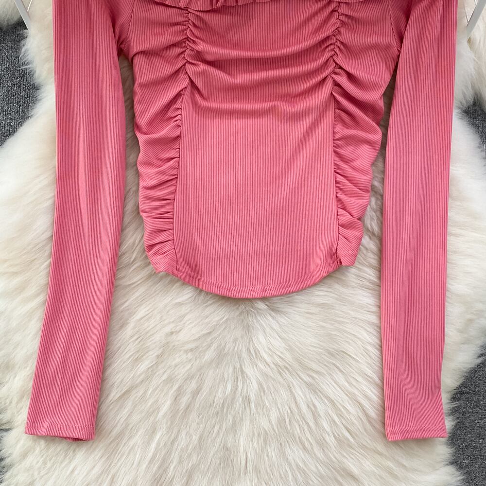 Nomikuma セクシーなメッシュパッチワークフリルシースルースタンドネックレディーストップ春底入れ長袖スリムグラフィック Tシャツ ロング スプリング 春物