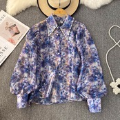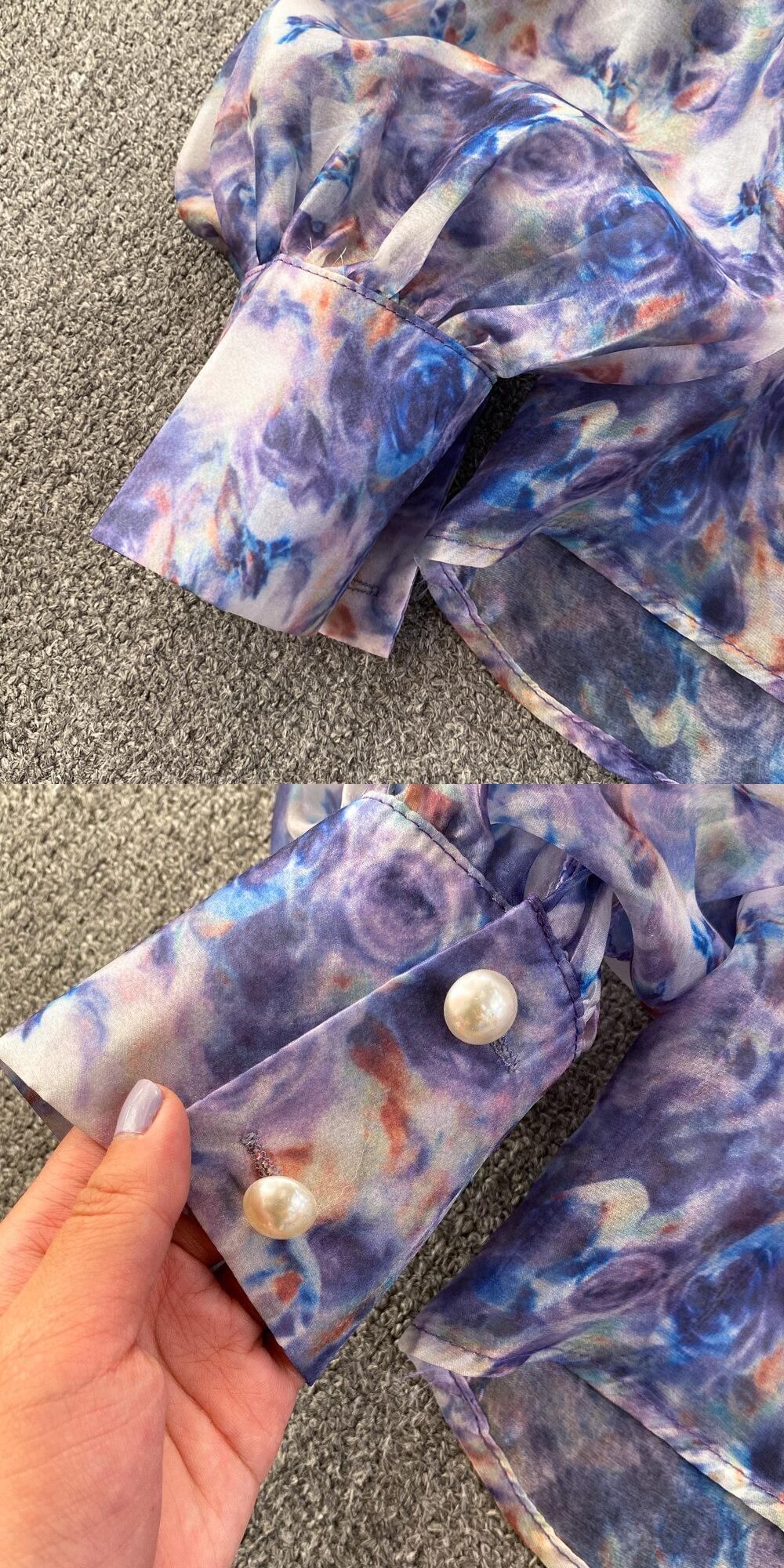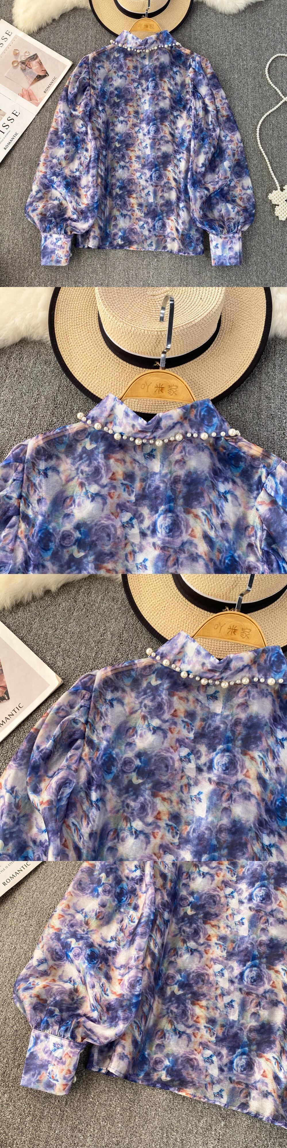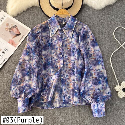 ノミクマ 春秋 長袖 ビーズ ターンダウンカラー 花柄 シフォン ブラウス シャツ ロング スプリング 春物 オータム 秋物
