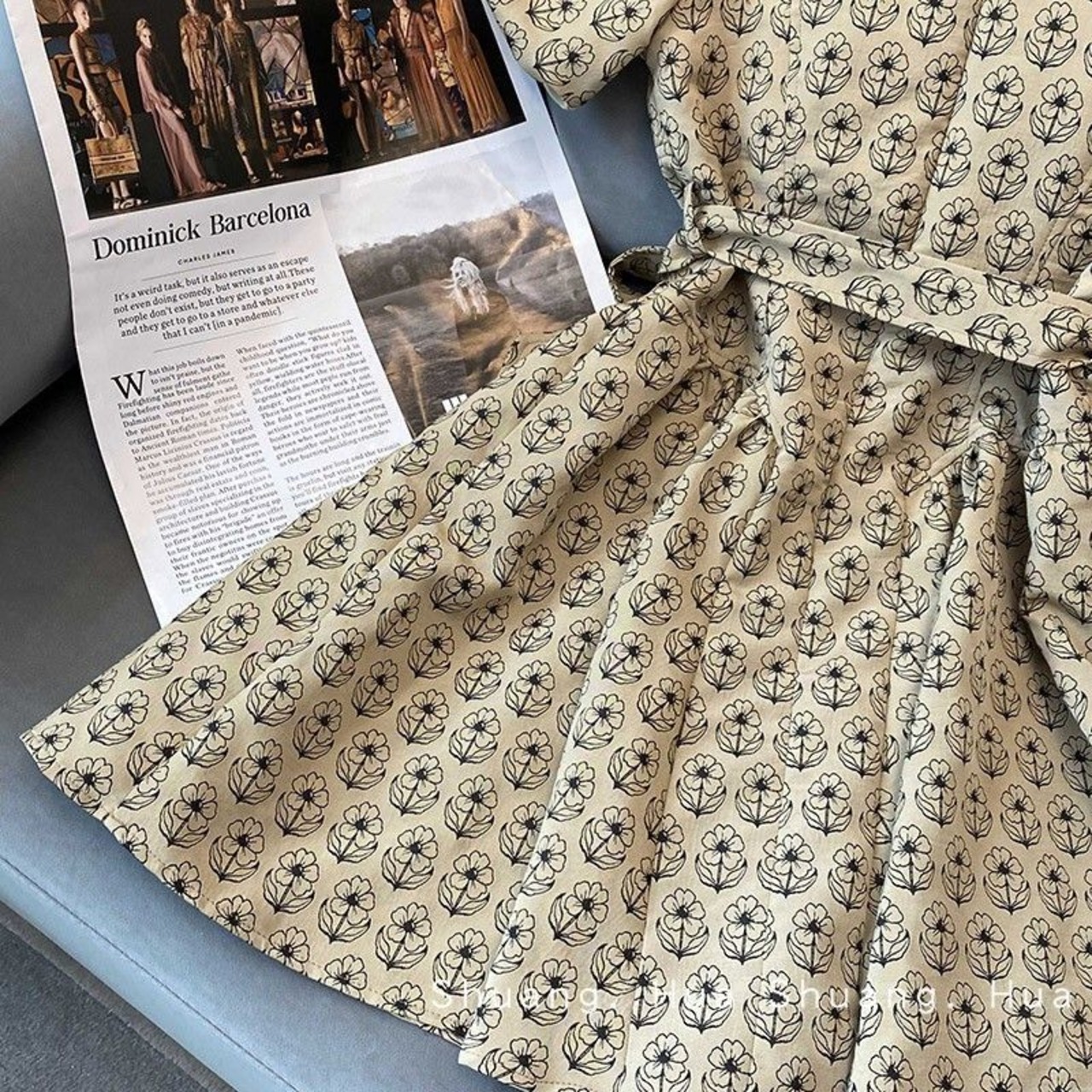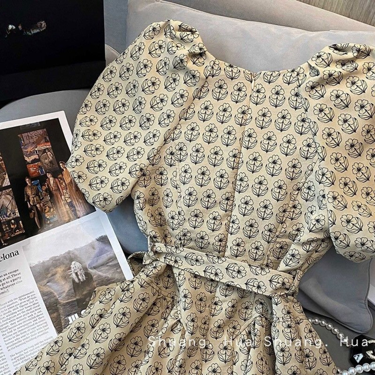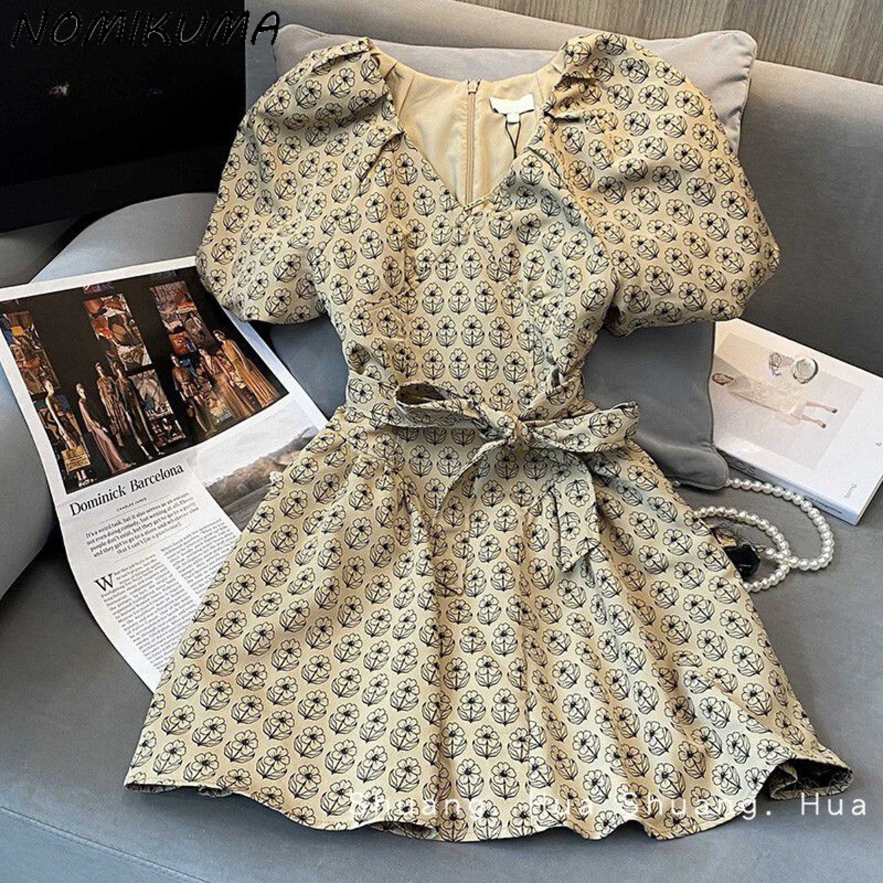 Nomikuma 花ドレス弓包帯スリムウエスト A ライン Vestidos 夏パフスリーブ V ネックドレス リボン サマー 夏物 花柄 Vネック Aライン
