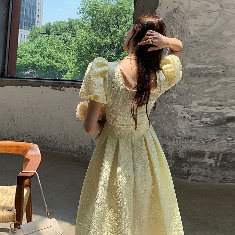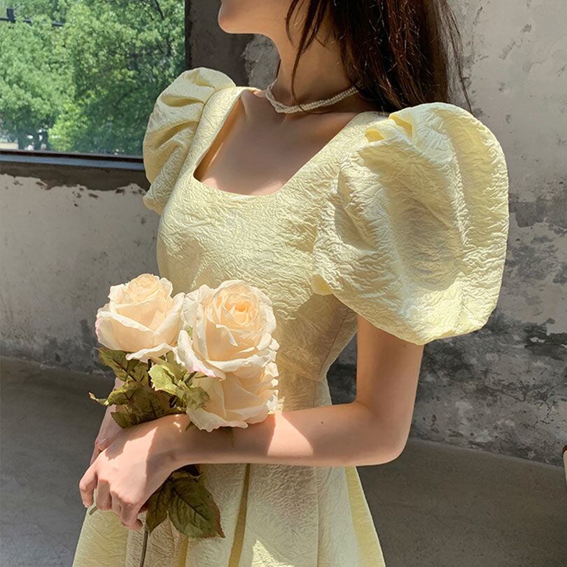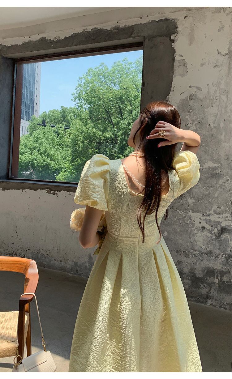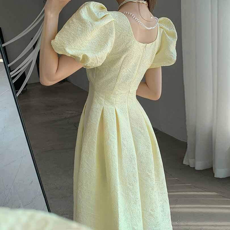 ノミクマスクエアカラースリムウエストジャカードドレスパフスリーブカジュアルAラインVestido スクウェア