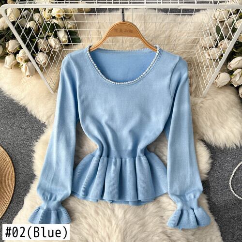 Nomikuma スプリングビーズ Oネック プルオーバー ニット フレア 長袖 スリムウエスト フリル Sweet Woman セーター ロング 大人ガーリー スウィート キュート カジュアル 春物