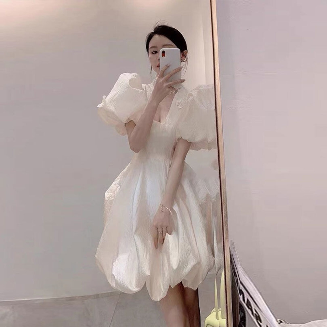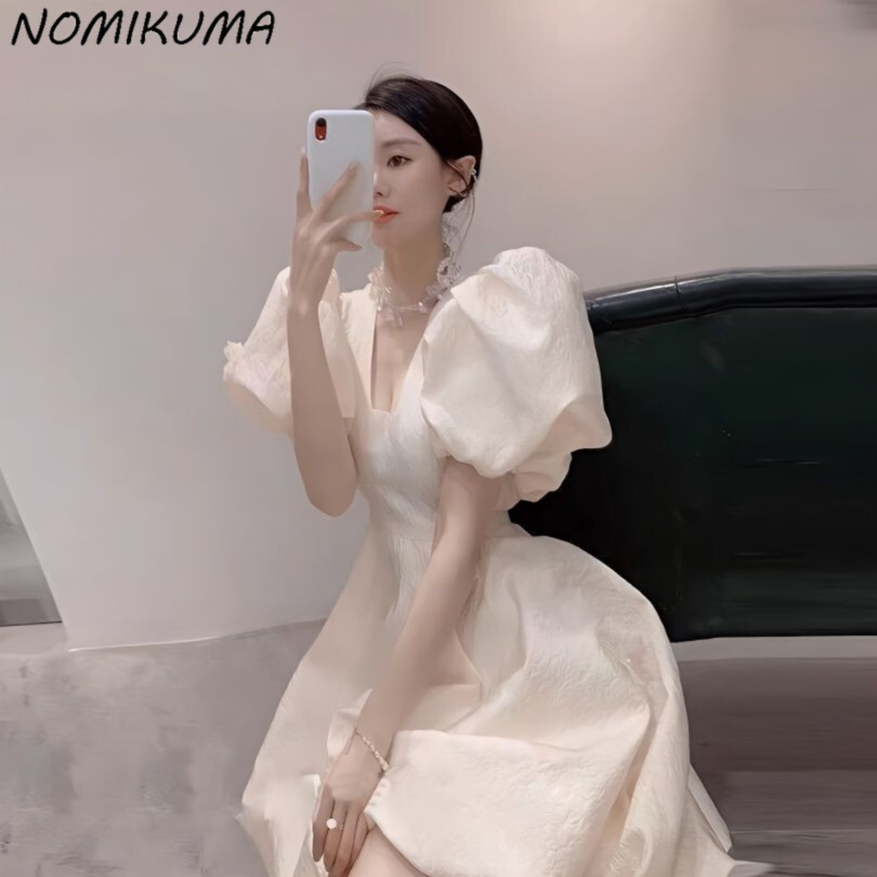 Nomikuma スリムウエストスウィートドレスパフスリーブ V ネックのシックな Vestidos サマードレス 大人ガーリー キュート カジュアル 夏物 Vネック