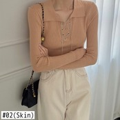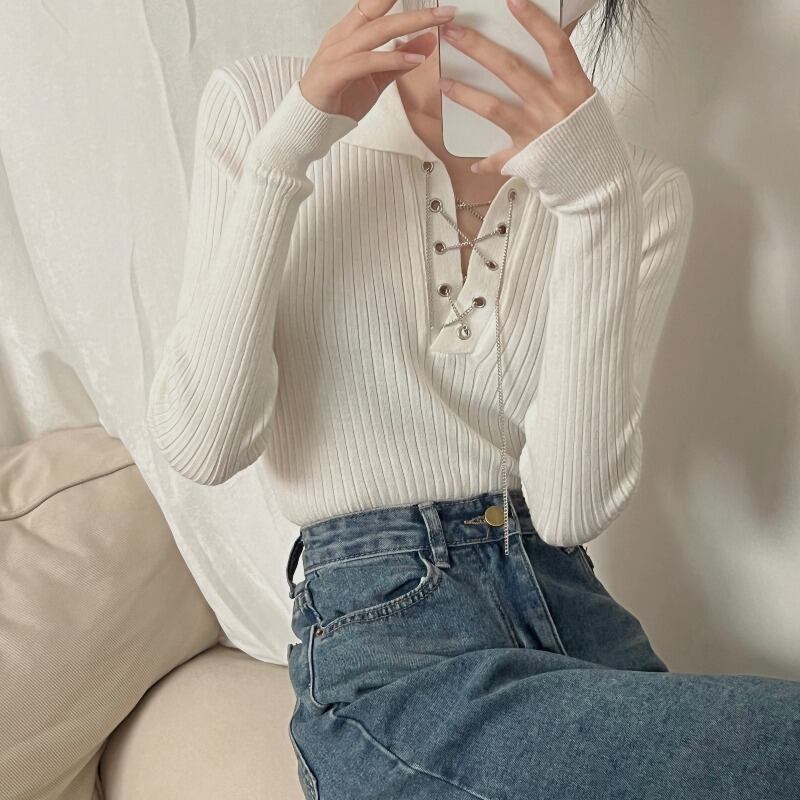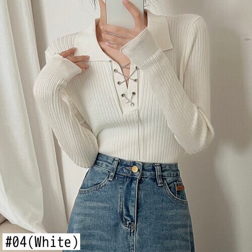 Nomikuma レースアップターンダウン襟ニット春秋スリムショートニットトップス底入れ長袖セーター ロング スプリング 春物 オータム 秋物