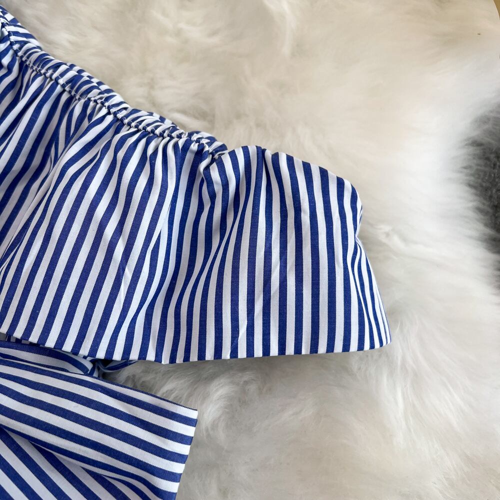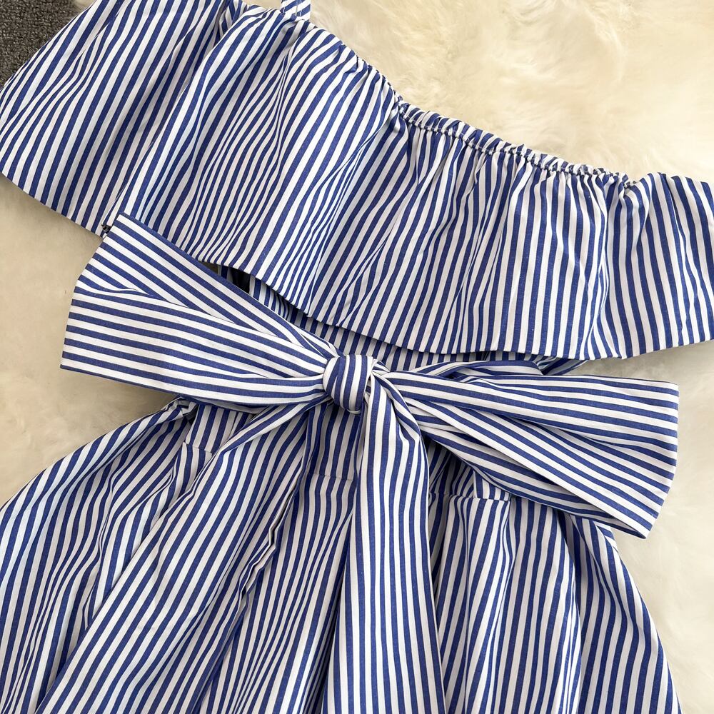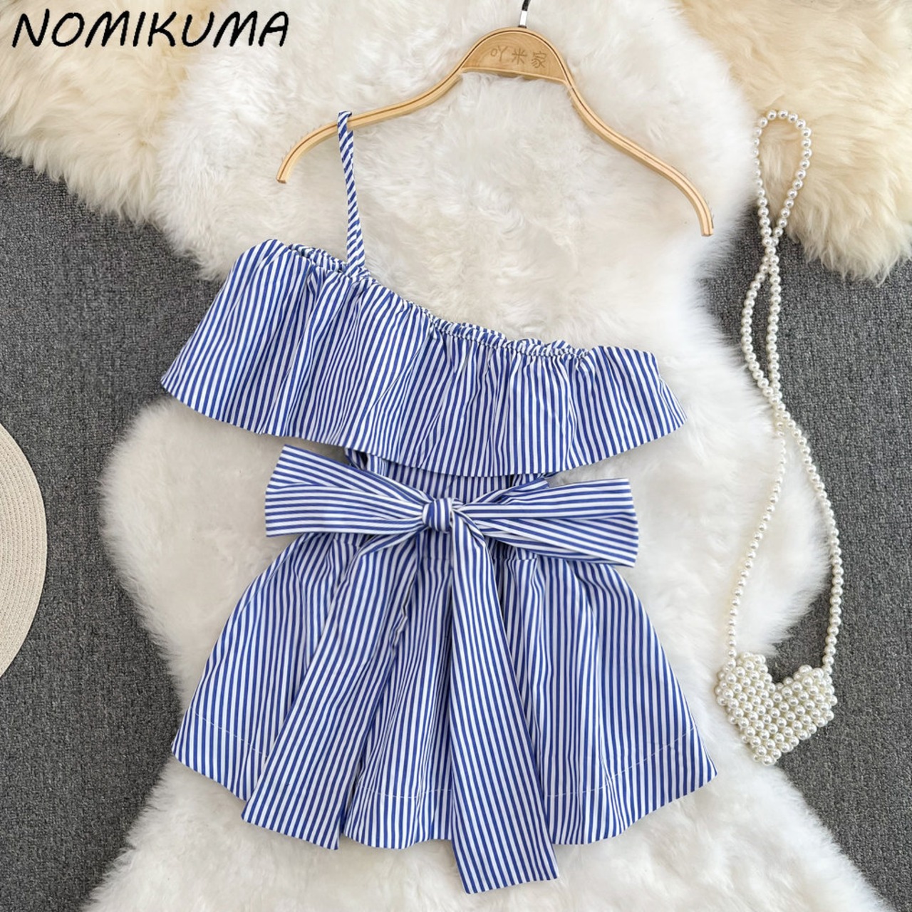 Nomikuma セクシーフリルオフショルダーストラップレススリングストライプブラウス弓包帯スリムウエストシックシャツ リボン