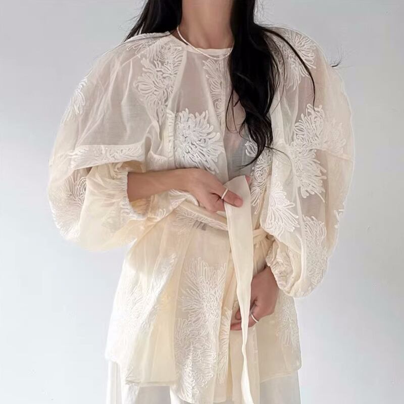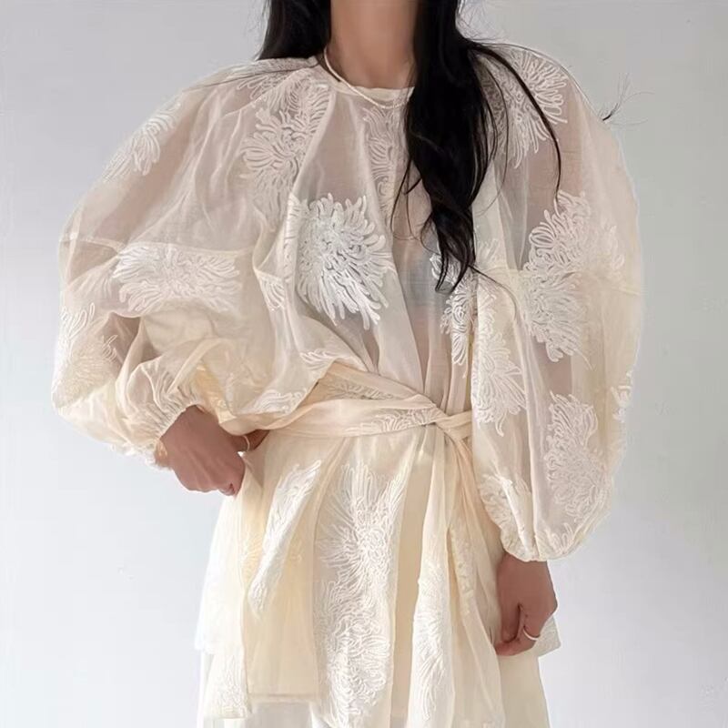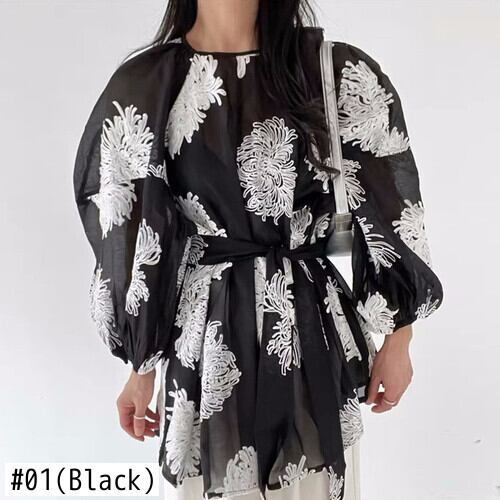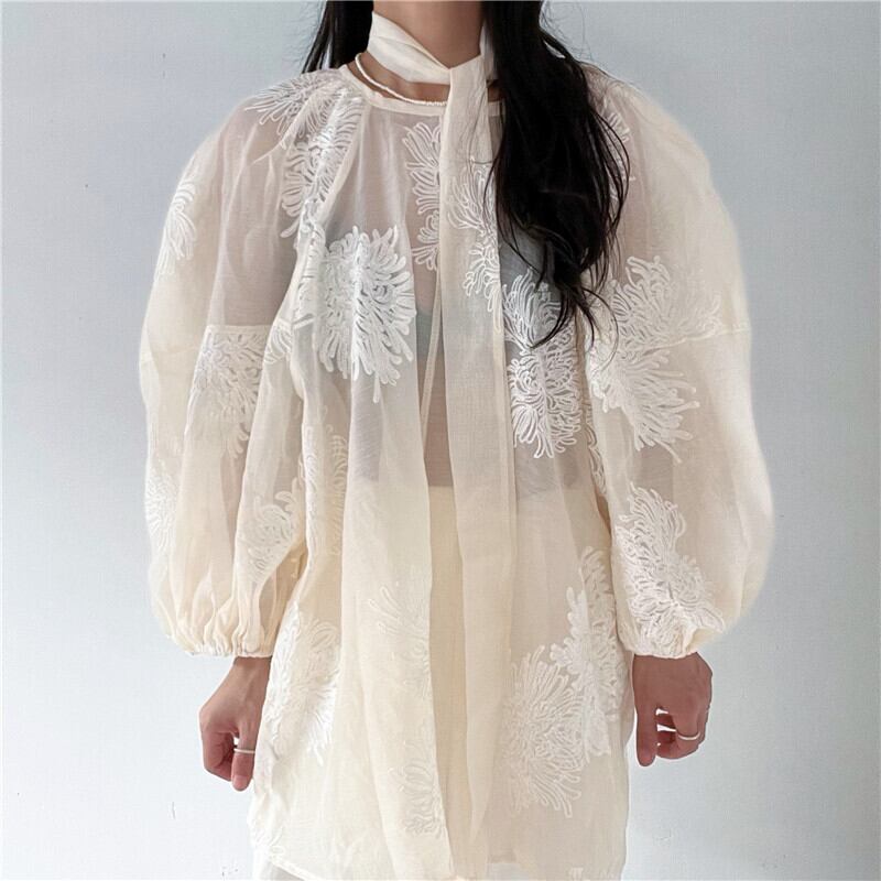 Nomikuma シック花刺繍ブラウスランタンスリーブレースアップスリムウエストシャツ夏トップス サマー 夏物 フラワーデザイン