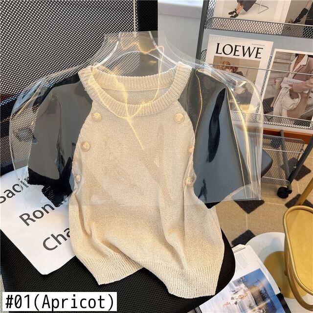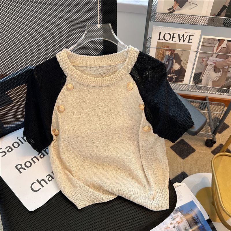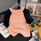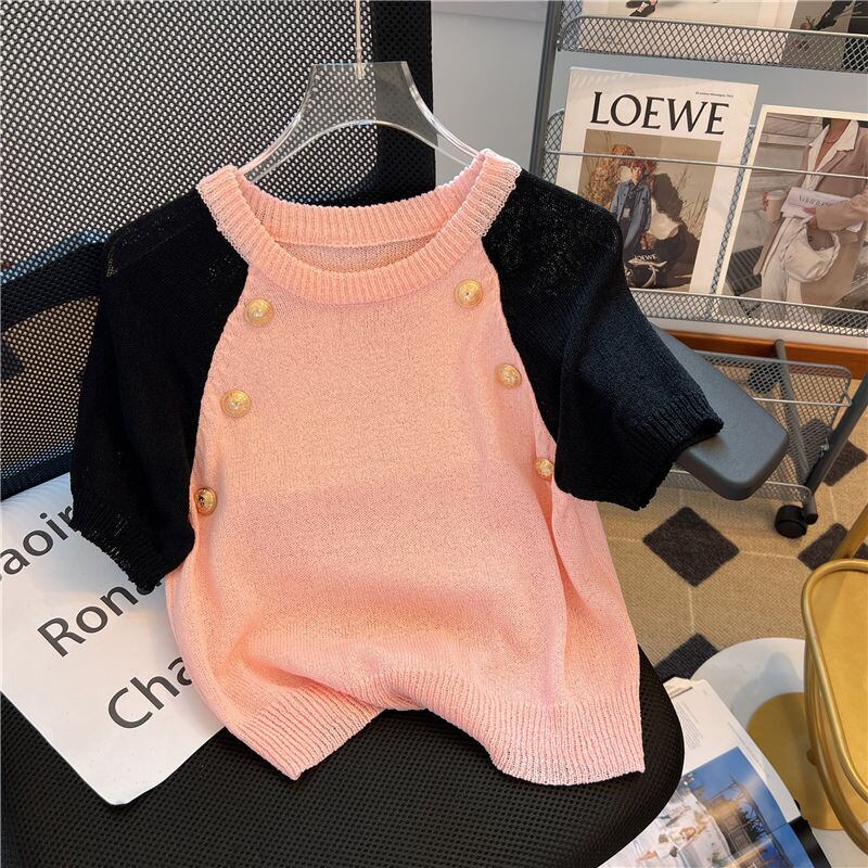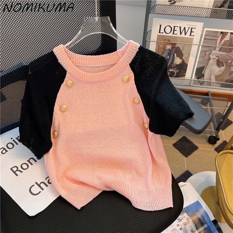 ノミクマ シック コントラストカラー 半袖 Oネック プルオーバー ニット カジュアル 夏 薄手 ニット セーター トップス セーター ショート ハーフスリーブ サマー 夏物