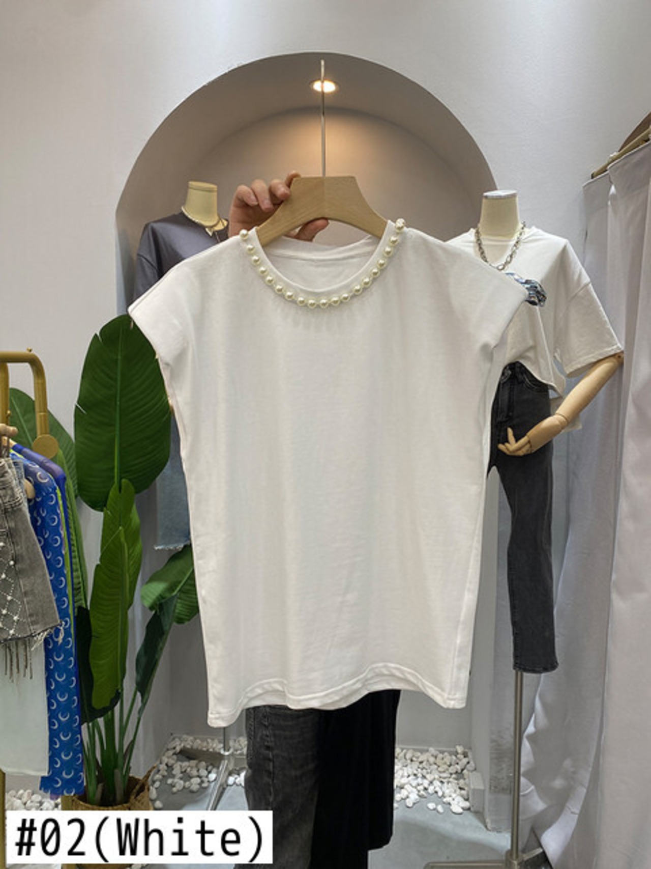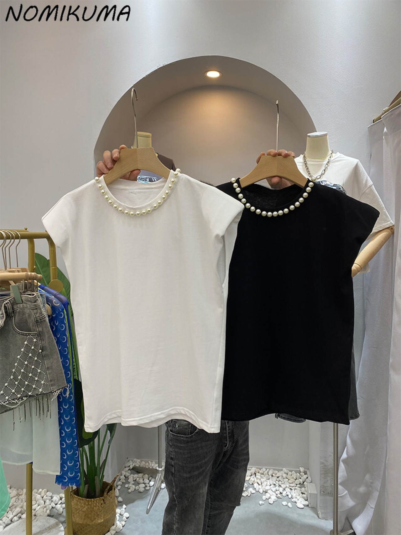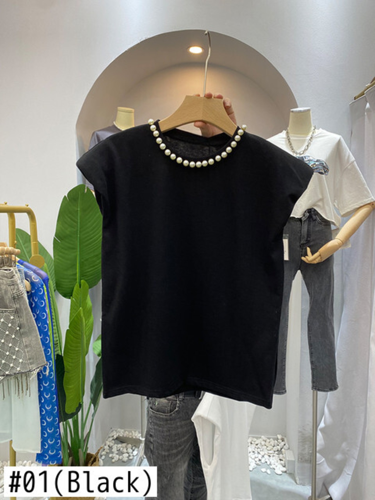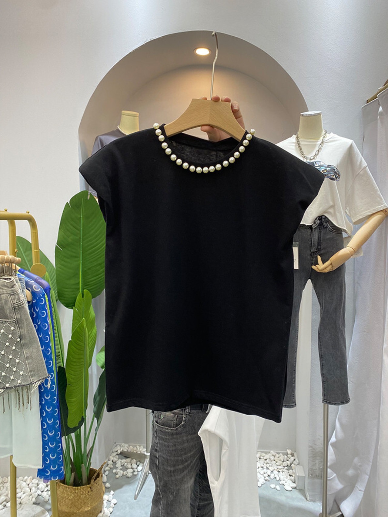 Nomikuma 夏ビーズ O ネック ノースリーブ シャツ因果無地プルオーバー グラフィック T シャツ サマー 夏物 Oネック Tシャツ ソリッドカラー