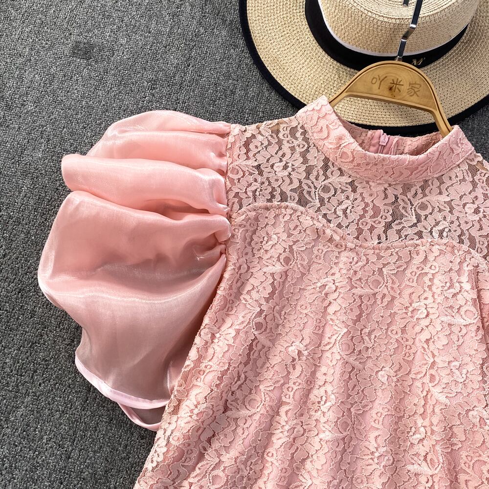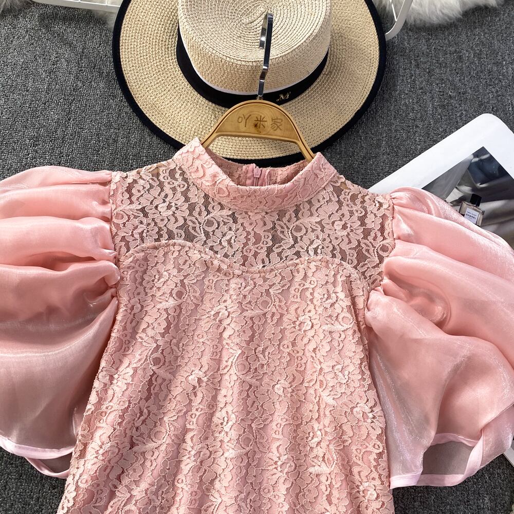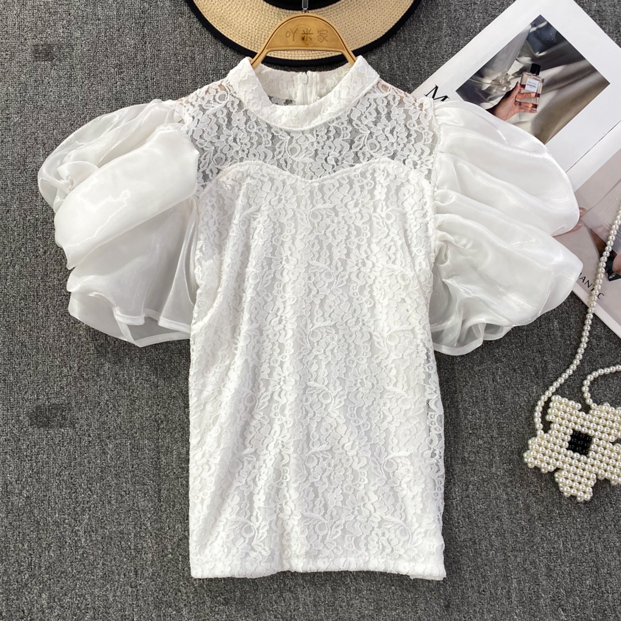 Nomikuma シックパフスリーブスタンドネックレースシャツ夏ブラウストップススリムデ サマー 夏物