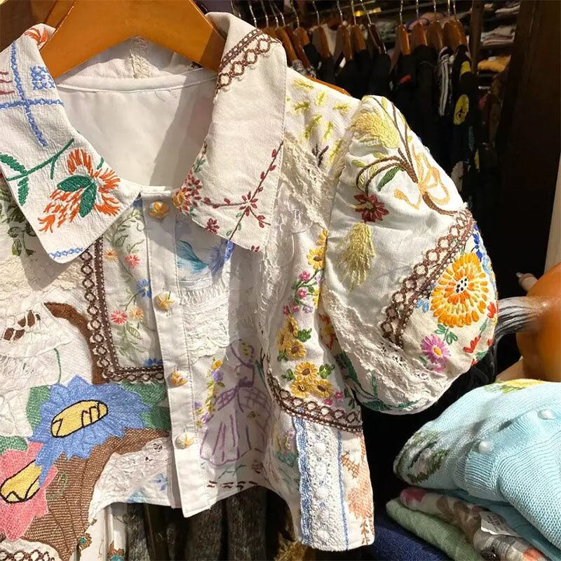 Nomikuma 夏刺繍パフスリーブブラウスターンダウン襟シックショートシャツ サマー 夏物