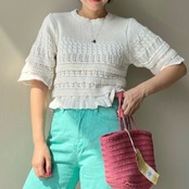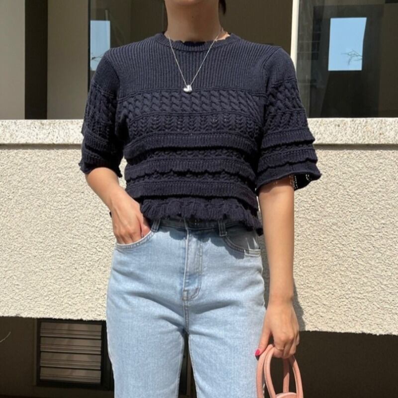 ノミクマ シック フリル フレアスリーブ Oネック プルオーバー ショート ニット トップス カジュアル 夏 ニット セーター サマー 夏物