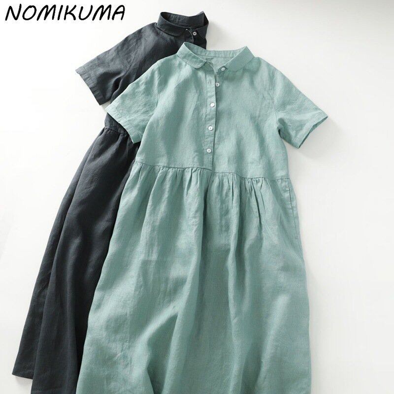 Nomikuma シックピーターパン襟半袖ドレス夏コットンリネンドレス因果 A ライン Vestidos ショート ハーフスリーブ サマー 夏物 Aライン ソリッドカラー