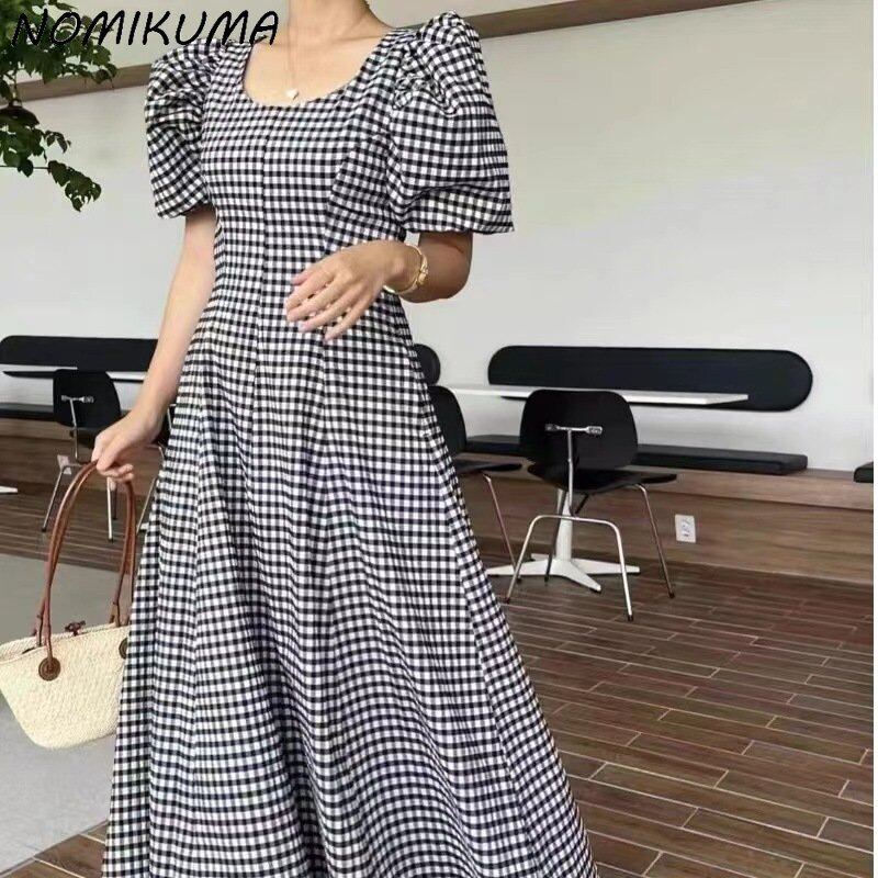 Nomikuma ヒットカラーチェック柄ドレスシックスクエアカラーパフスリーブドレススリムウエスト因果 A ライン Vestidos Aライン スクウェア