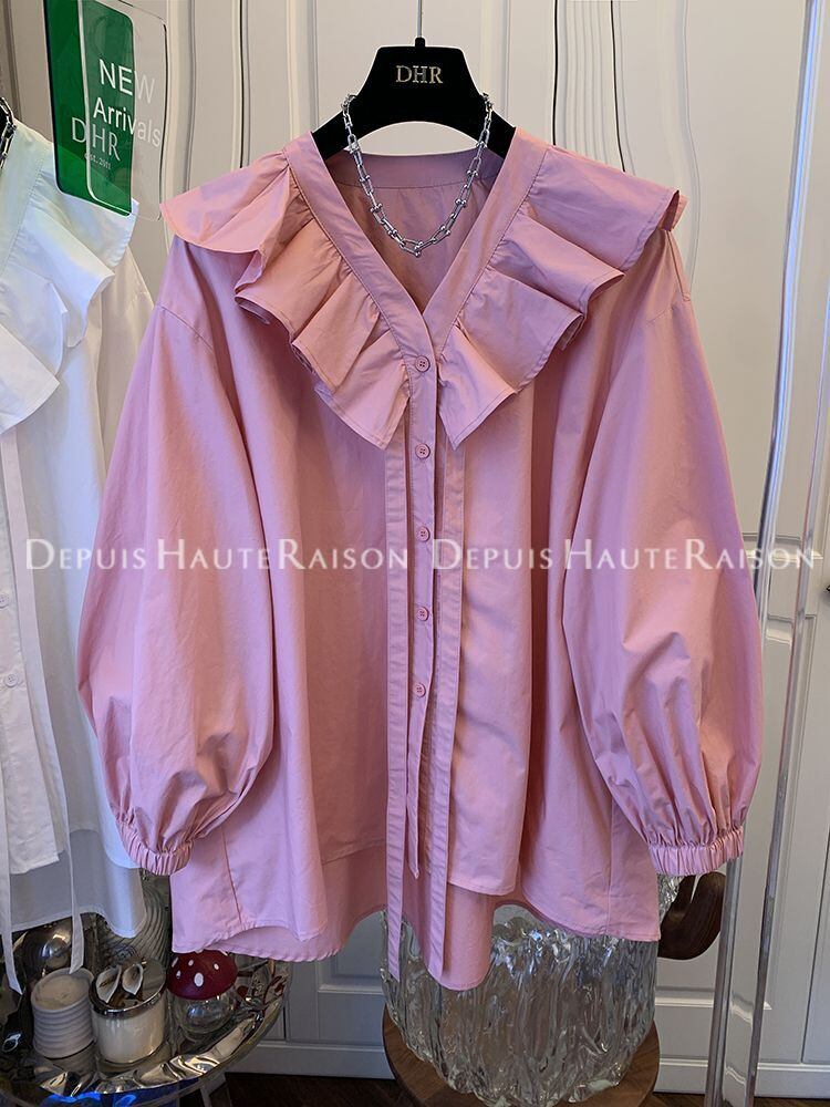 ノミクマ シック フリル パッチワーク Vネック ブラウス シャツ カジュアル 長袖 シングルブレスト リボン レディース トップス ロング