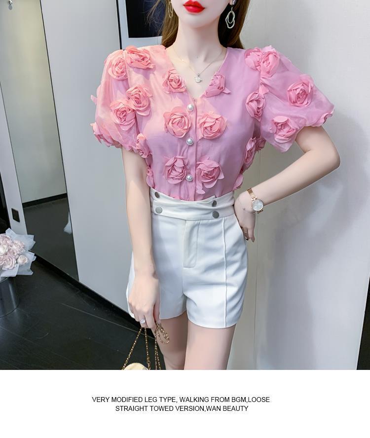 Nomikuma シック 3D 花ブラウス トップス パフ スリーブ V ネック シングル ブレスト夏シャツ サマー 夏物 Vネック フラワーデザイン
