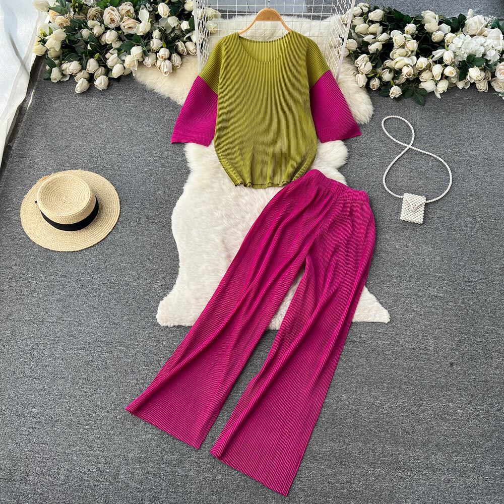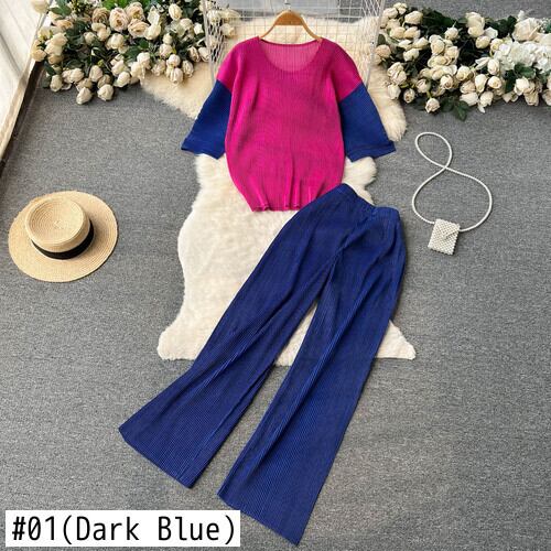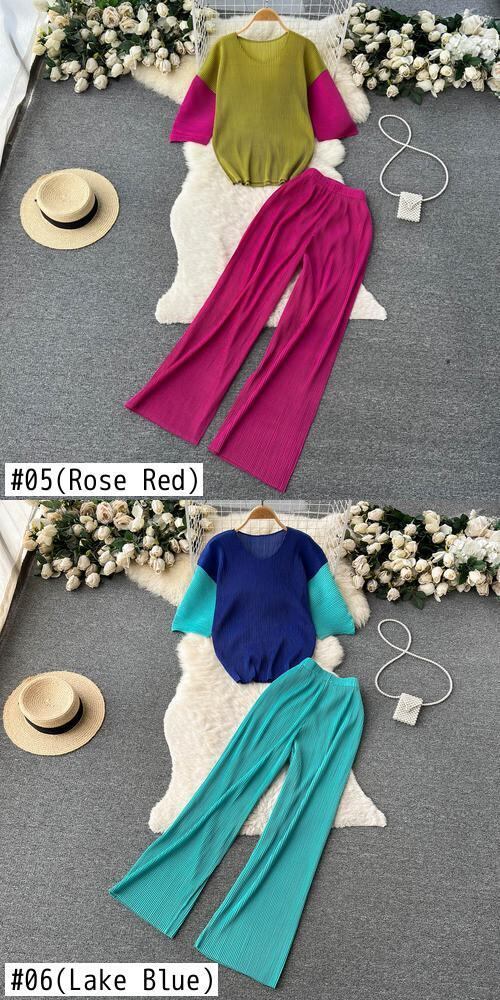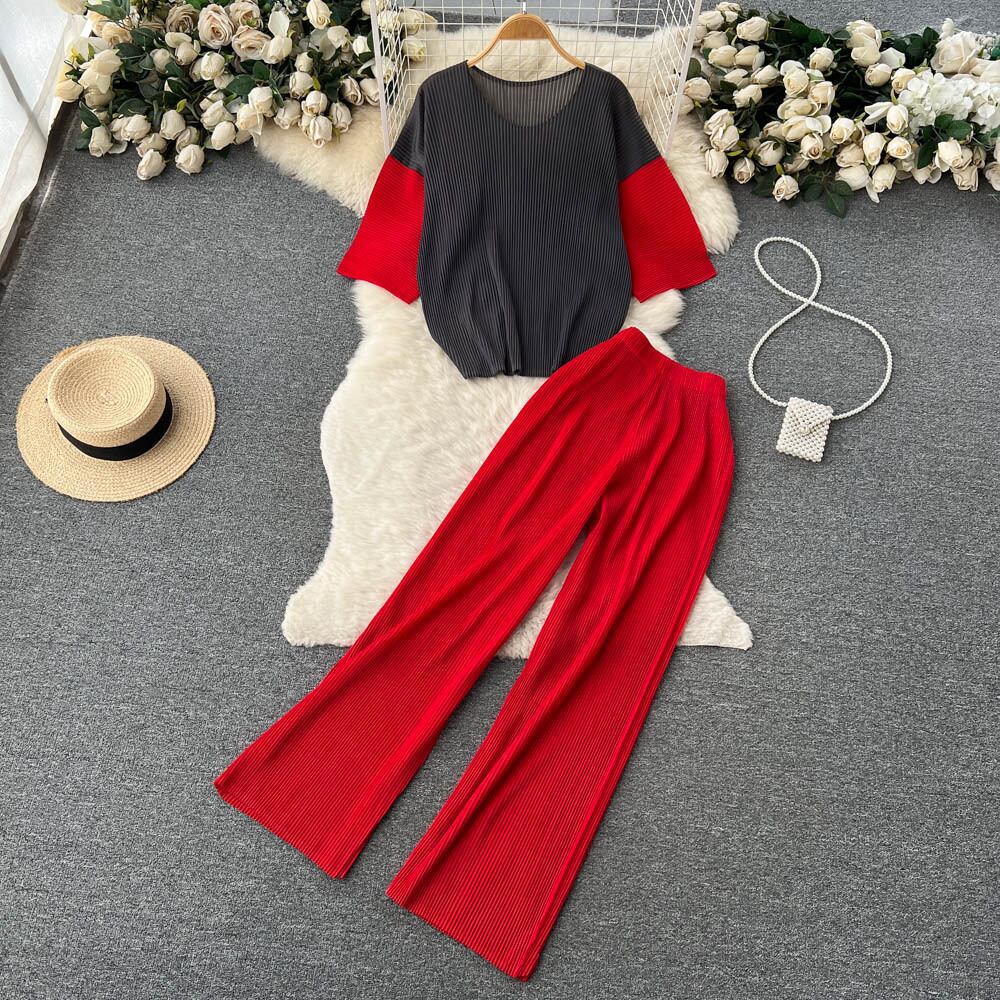 ノミクマ 2点セット レディース カジュアル ヒットカラー 半袖 Oネック トップス+ウエスト ワイドレッグ ロングパンツ 夏 ショート ハーフスリーブ サマー 夏物 ワイドパンツ
