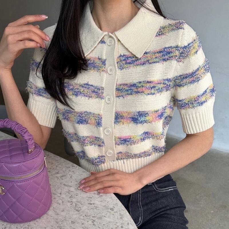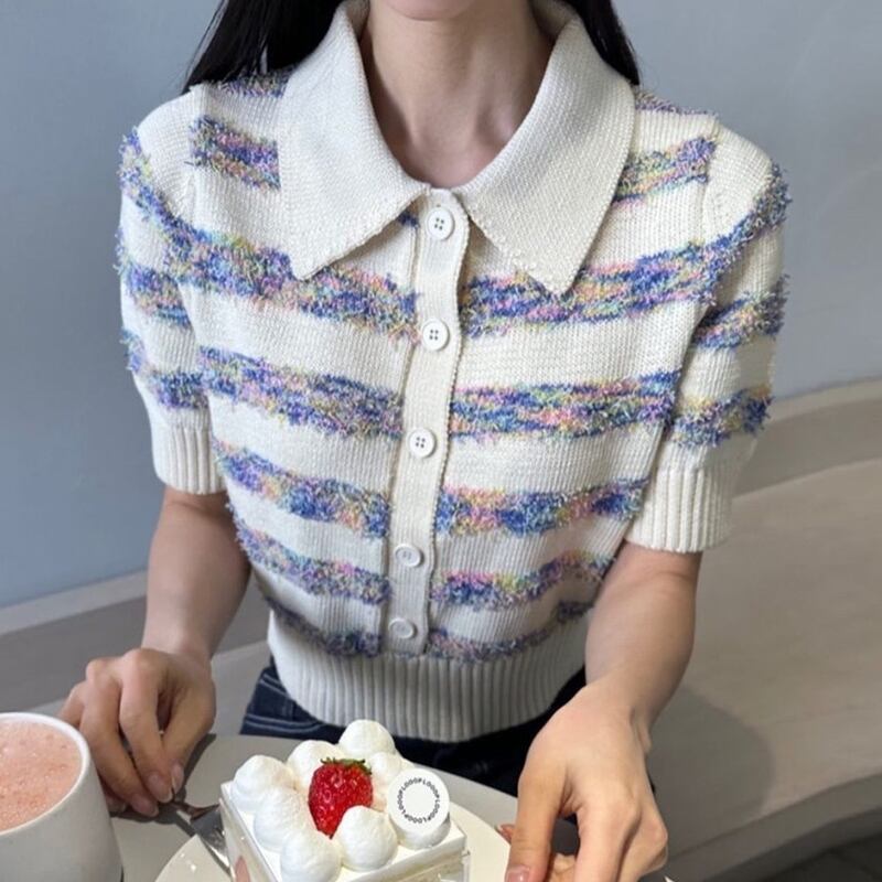 ノミクマ シックサマー ターンダウンカラー ヒットカラー ストライプ ジャガード スリム 半袖 ニット トップス プルオーバー ショート ハーフスリーブ 夏物