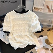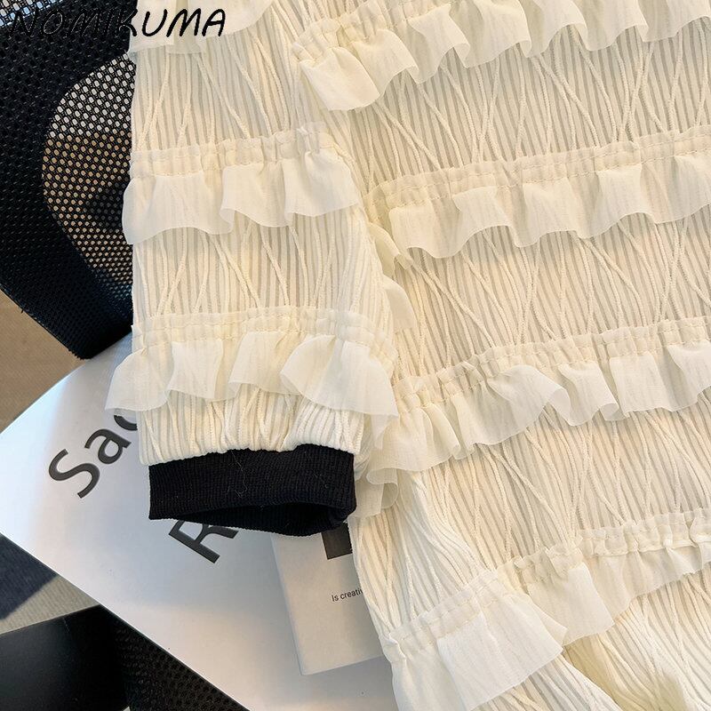 Nomikuma 夏トップス因果ヒットカラー半袖 O ネック Tシャツシックフリルパッチワークスウィートシャツ ショート ハーフスリーブ 大人ガーリー キュート カジュアル サマー 夏物 Oネック