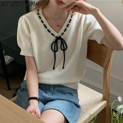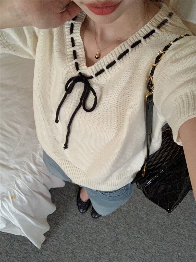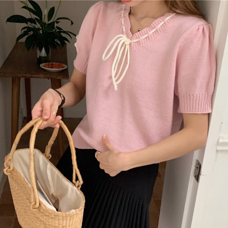 ノミクマ ヒットカラー 巾着 レースアップ Vネック パフスリーブ ニット トップス カジュアル プルオーバー 夏 ニット セーター サマー 夏物