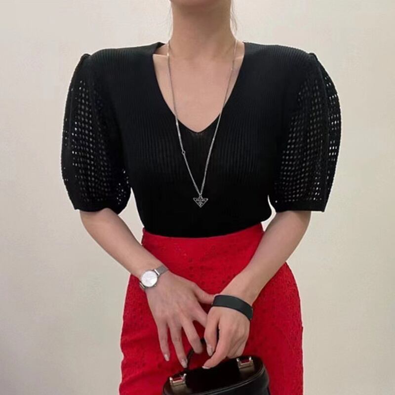 Nomikuma シック夏 V ネックスリムニットトップス中空アウトパフスリーブ底入れニットセーター サマー 夏物 Vネック