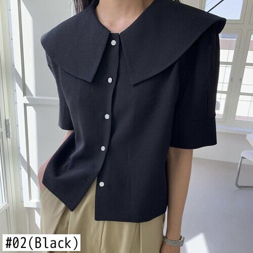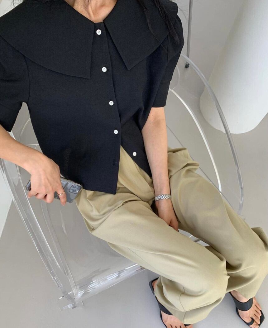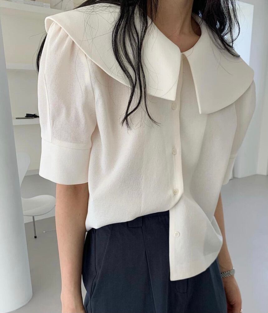 ノミクマシックサマーターンダウンカラーカジュアルブラウスシャツパフスリーブシングルブレストデ 夏物