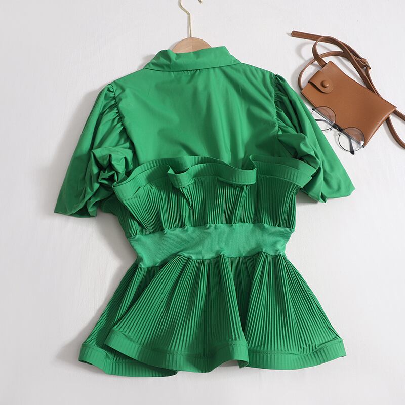 Nomikuma 3D フリルパッチワークシャツスリムウエストシックブラウストップス夏パフスリーブデ サマー 夏物