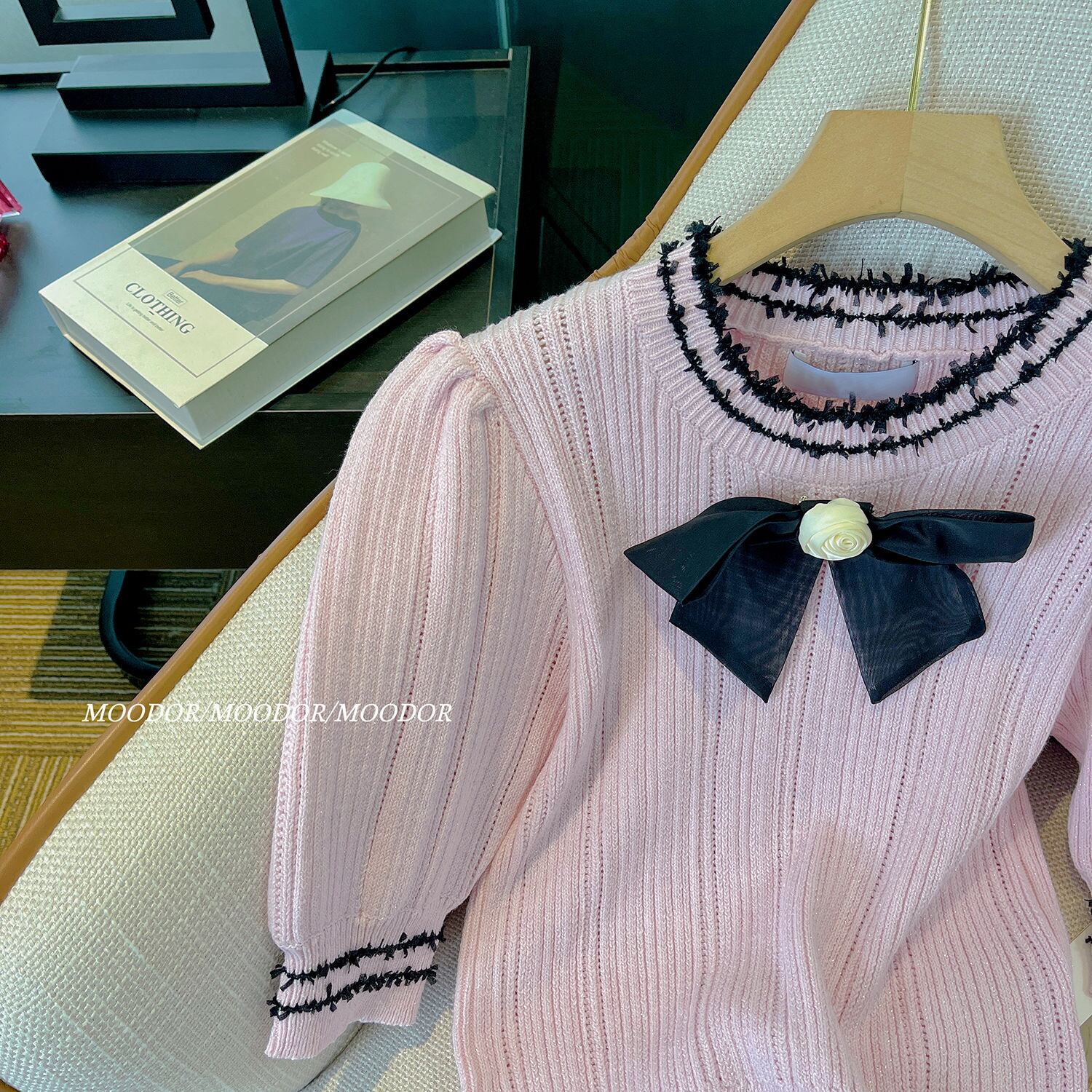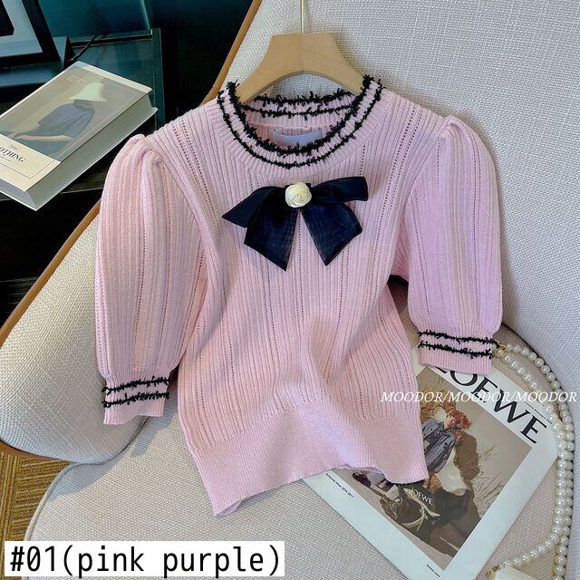 Nomikuma シックヒットカラーパフスリーブ O ネックニット Tシャツ甘いちょう結びトップス因果夏スリムグラフィック Tシャツ リボン 大人ガーリー スウィート キュート カジュアル サマー 夏物 Oネック